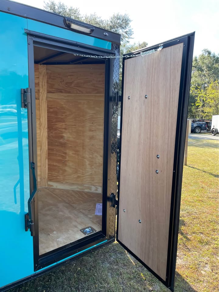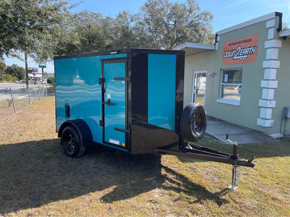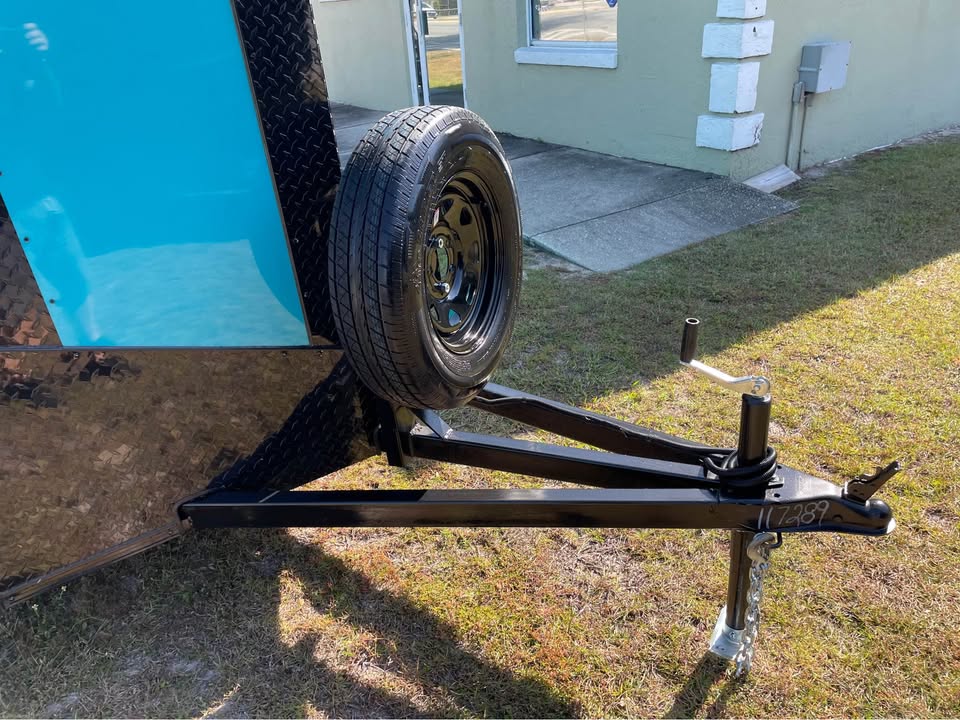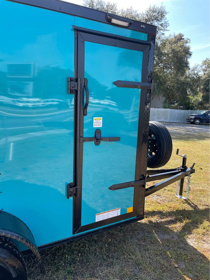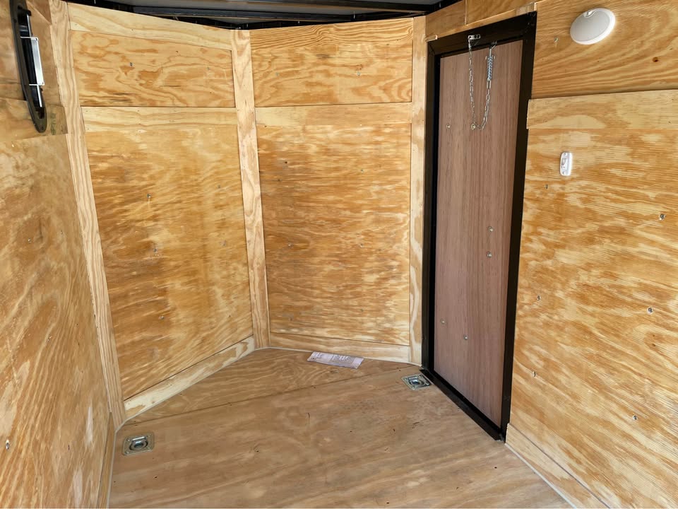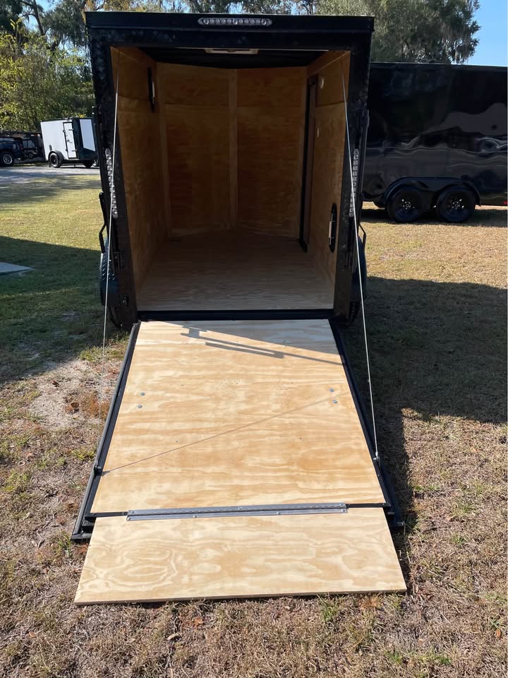 5×8 single axle – Blackout Pkg – 5’6” interior height – Overall height – 85” – 8’ + 2’ V-nose – 3500# axle w/ EZ lube hubs – .080 Polycore – Semi-screwed exterior – Ramp door w/ double handles – Fold down stabilizer jacks – LED full light package – LED rear loading light – 24” factory built side door w/ bar lock & loading light – 205/75R/15 Radial tires – Extended Tongue w/ Spare Mount – Spare tire included – Atp fenders – Thermo-cool ceiling liner – 12v dome light – V-nose w/ Slanted stoneguard – 16” on center sidewalls, floor & ceiling – 3/4 plywood floors – 3/8 plywood walls – 2 Way aluminum side vents – 3” steel tube main frame – 2” coupler – 4 way flat light plug – 5 year limited manufacturer warranty