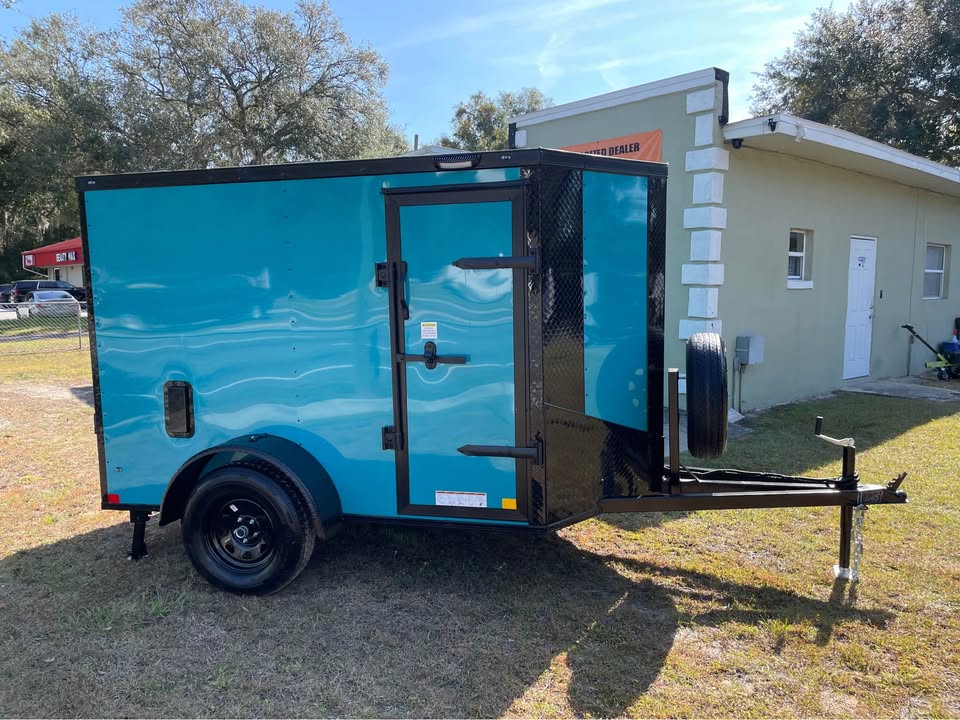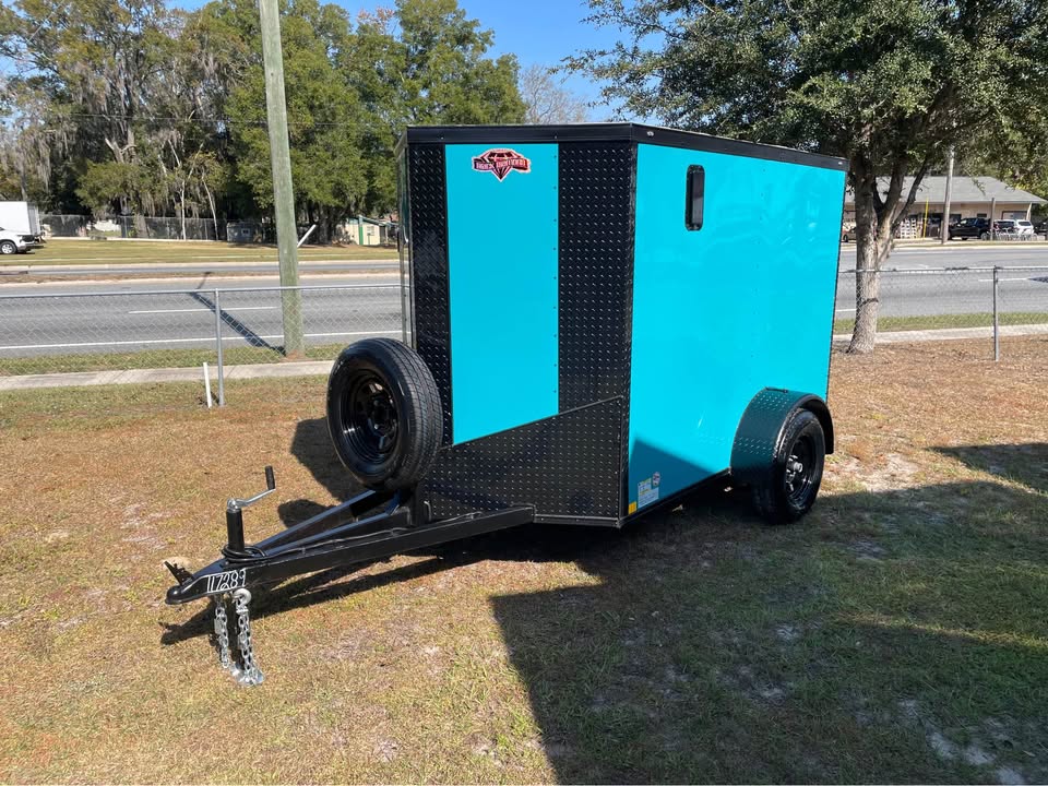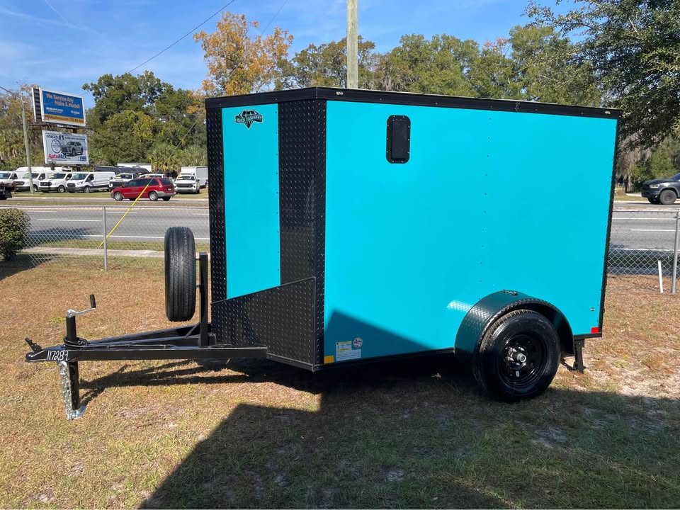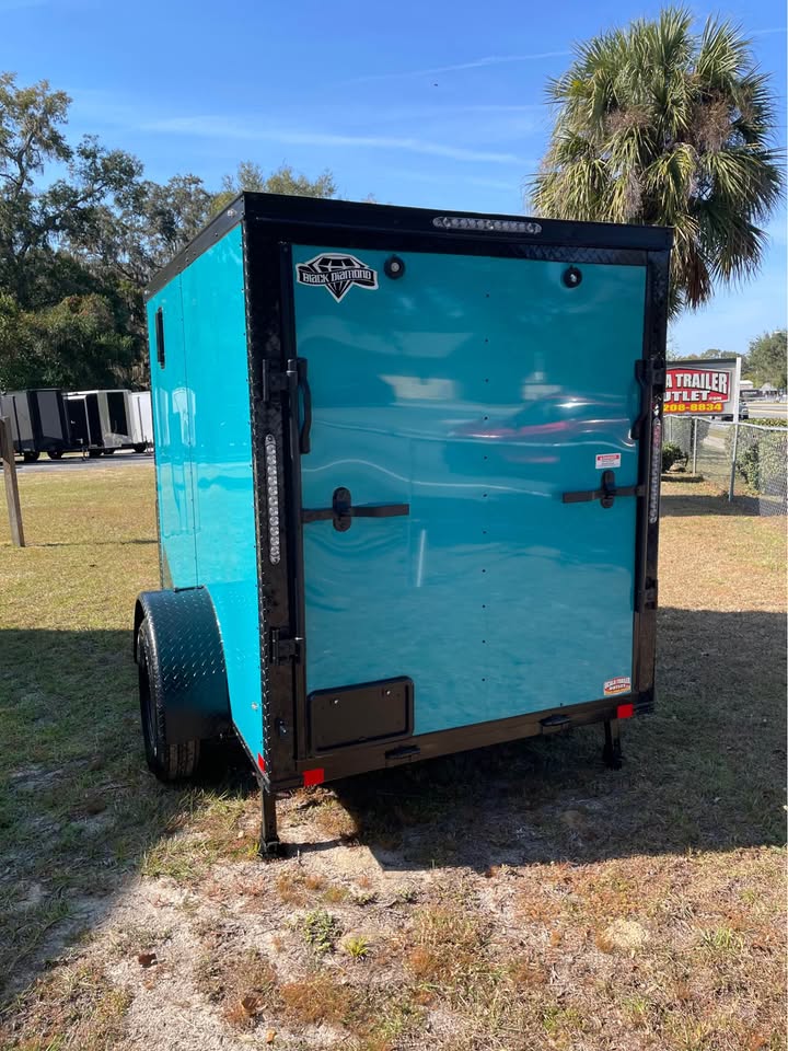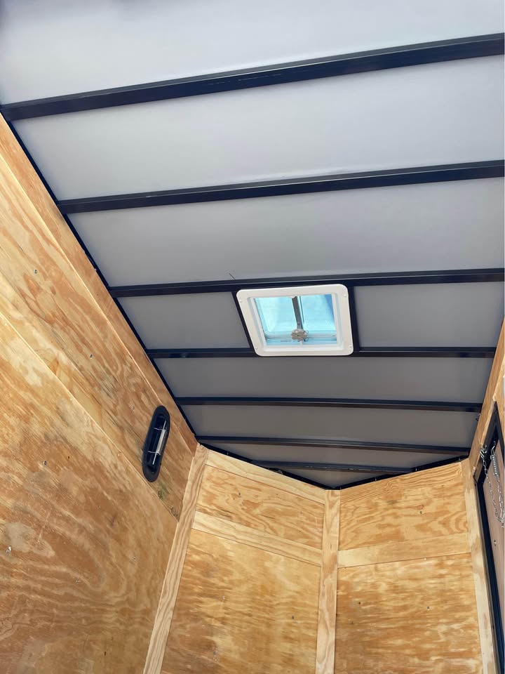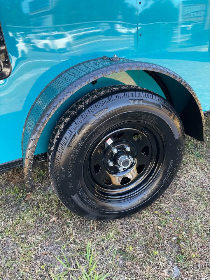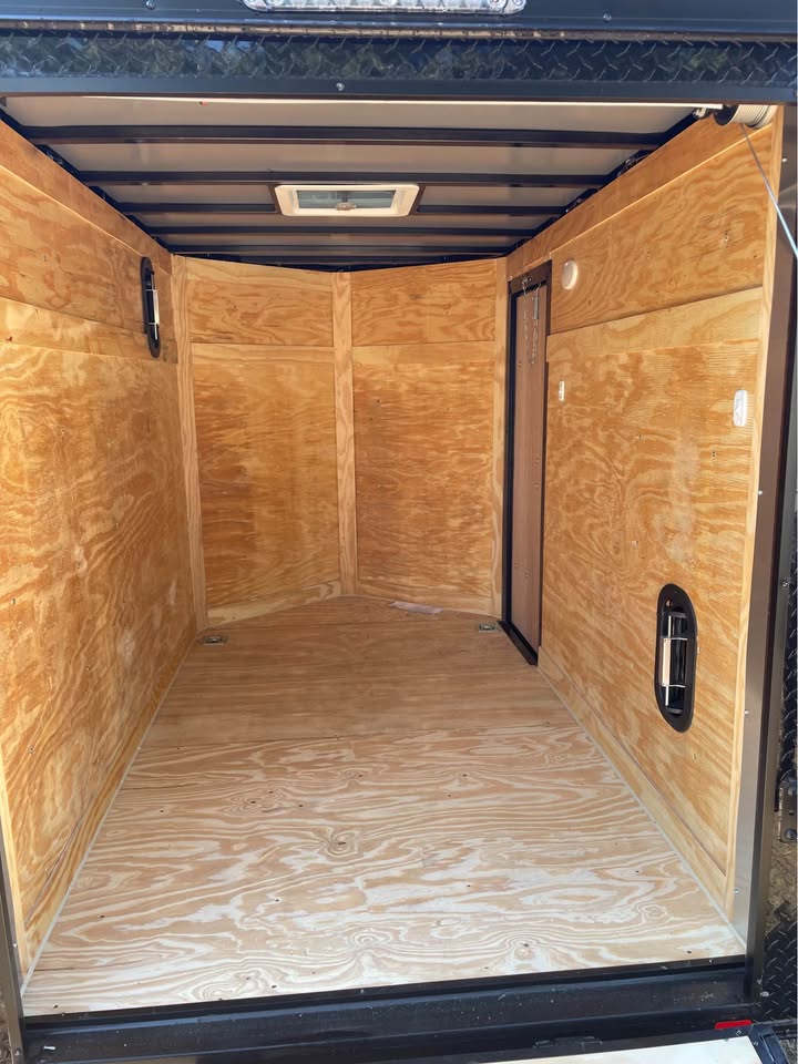 5×8 single axle – Blackout Pkg – 5’6” interior height – Overall height – 85” – 8’ + 2’ V-nose – 3500# axle w/ EZ lube hubs – .080 Polycore – Semi-screwed exterior – Ramp door w/ double handles – Fold down stabilizer jacks – LED full light package – LED rear loading light – 24” factory built side door w/ bar lock & loading light – 205/75R/15 Radial tires – Extended Tongue w/ Spare Mount – Spare tire included – Atp fenders – Thermo-cool ceiling liner – 12v dome light – V-nose w/ Slanted stoneguard – 16” on center sidewalls, floor & ceiling – 3/4 plywood floors – 3/8 plywood walls – 2 Way aluminum side vents – 3” steel tube main frame – 2” coupler – 4 way flat light plug – 5 year limited manufacturer warranty