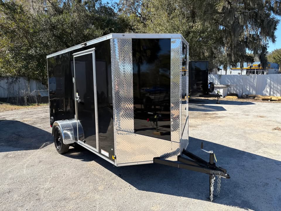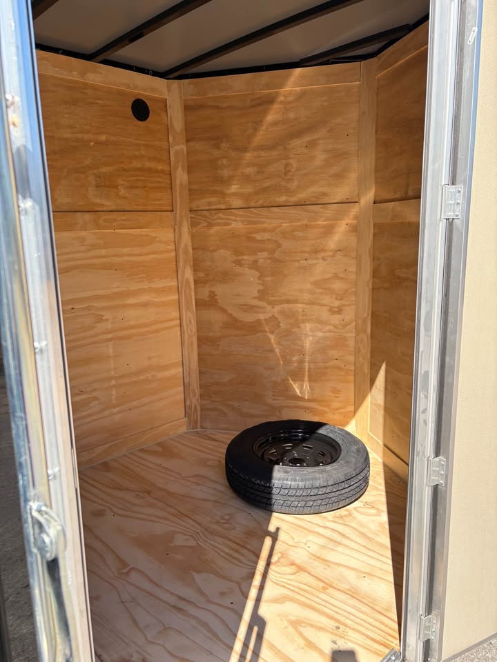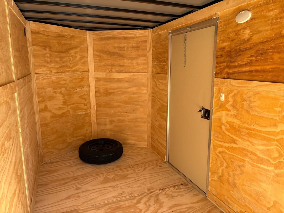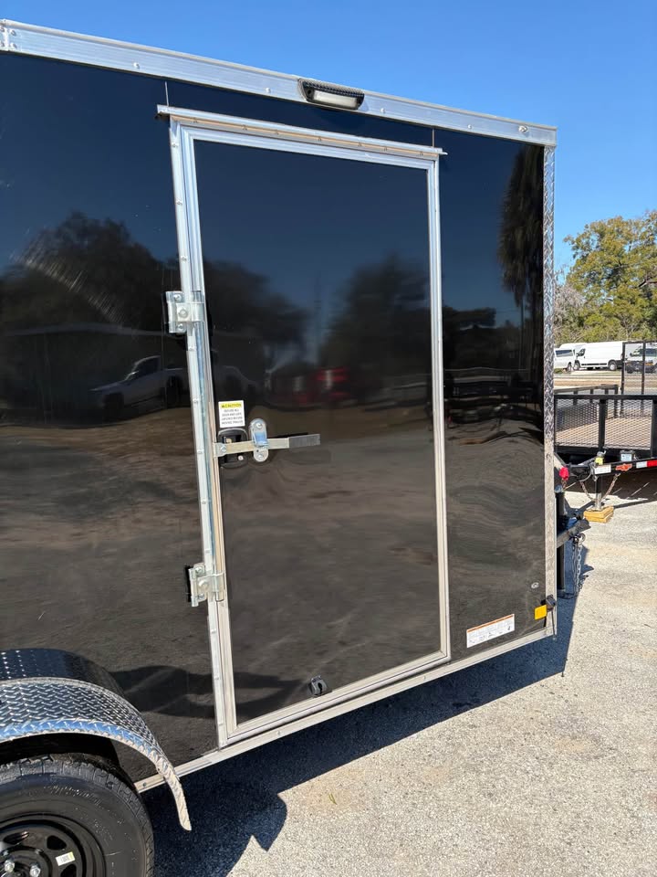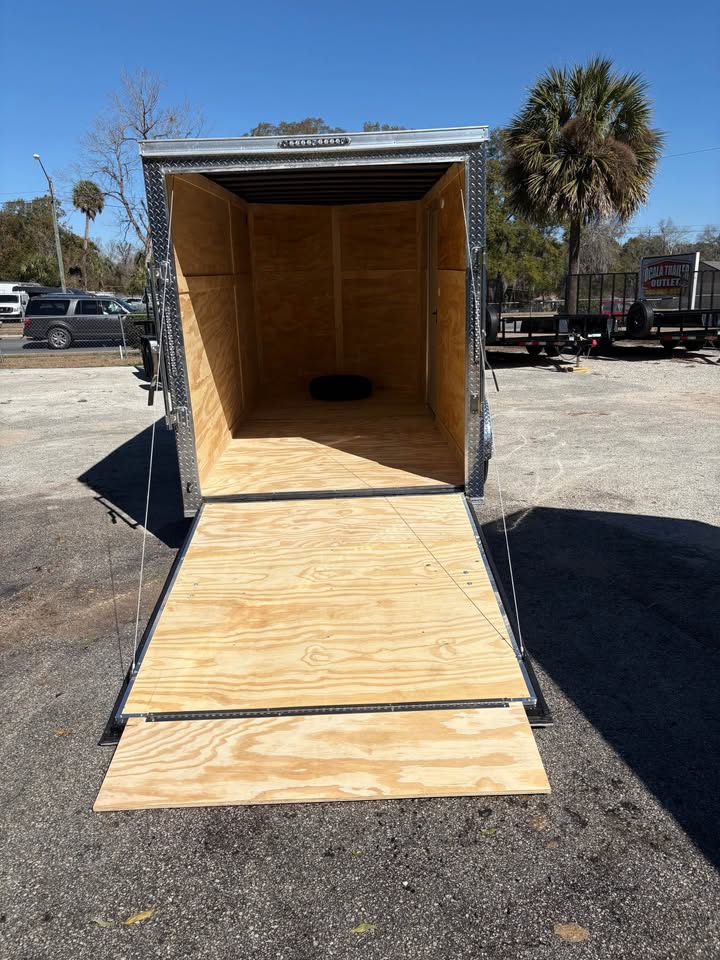 6×12 Single Axle Cargo Trailer – 6’6” interior height – 12’ + 2’ V- nose – 60” Triple Tube Tongue(Extended tongue) – .080 Poly-Cor Siding – Semi screwless exterior – 3500# axle w/ EZ lube hubs – Thermo cool ceiling liner – Brace for A/C or Roof Vent – 36” Side door w/ flush lock w/ Loading Light & bar lock – Ramp door w/ flap – V-nose w/ Slanted stoneguard – 3/4 plywood floors – 3/8 plywood walls – 3” steel tube main frame – 16” on center roof, walls & floor – Side Vents – LED light package – LED rear loading light – ATP fenders – 205/75/15 radial tires – 2” coupler – 4 way flat light plug – 5 year limited manufacturer warranty