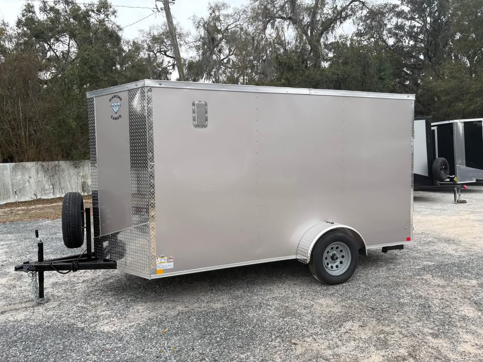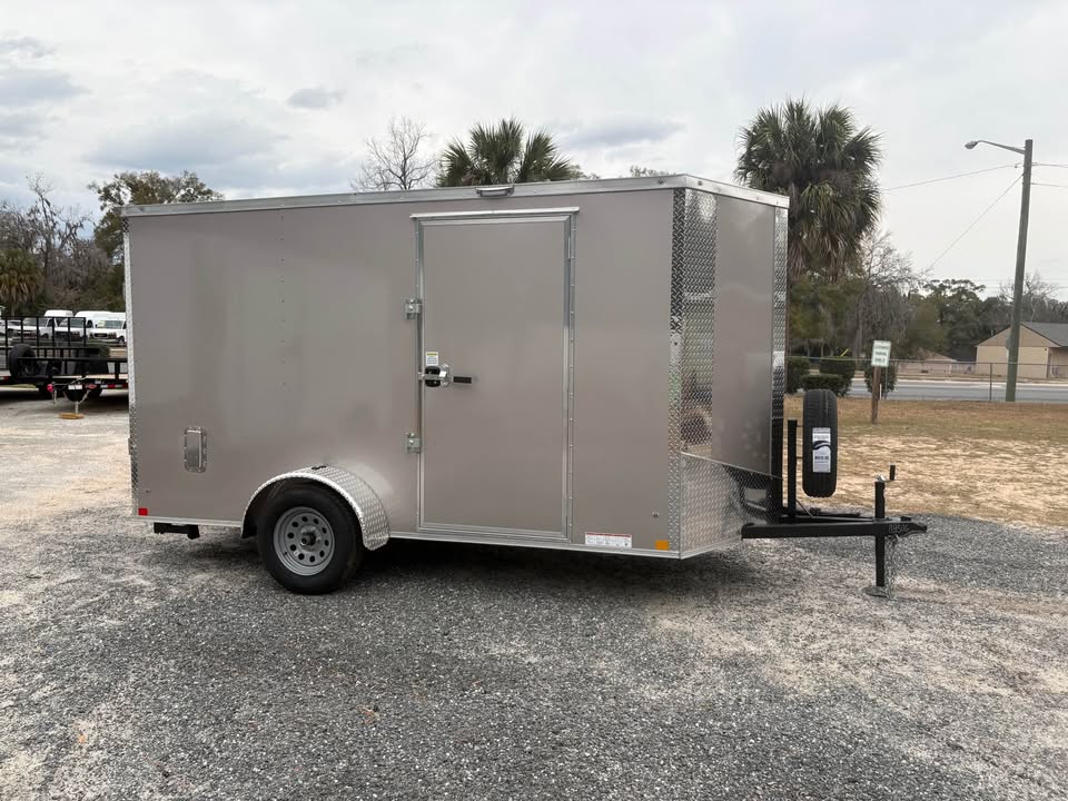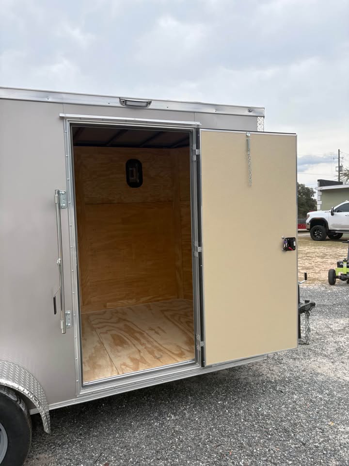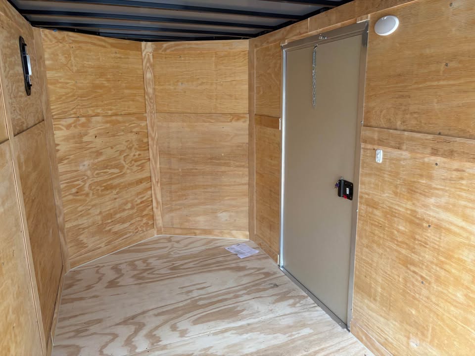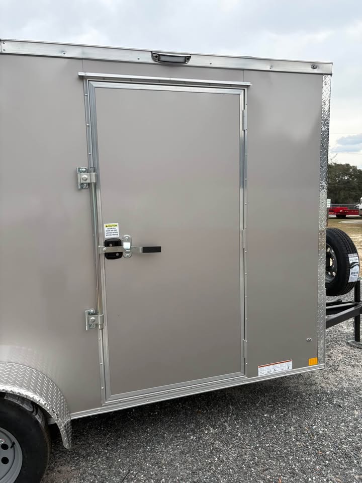 6×12 Single Axle Cargo Trailer – 6’6” interior height – 12’ + 2’ V- nose – 60” Triple Tube Tongue(Extended tongue) – Fold Down Jack Stabilizers – .080 Poly-Cor Siding – Semi screwless exterior – 3500# axle w/ EZ lube hubs – Thermo cool ceiling liner – Non Powered Roof Vent – 36” Side door w/ flush lock w/ Loading Light & bar lock – Ramp door w/ flap – V-nose w/ Slanted stoneguard – 3/4 plywood floors – 3/8 plywood walls – 3” steel tube main frame – 16” on center roof, walls & floor – Side Vents – LED light package – LED rear loading light – ATP fenders – 205/75/15 radial tires – 2 5/16” coupler – 4 way flat light plug – 5 year limited manufacturer warranty