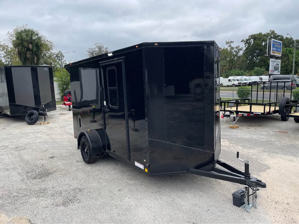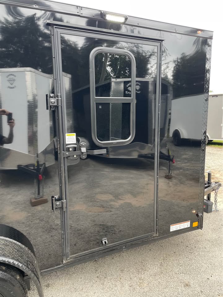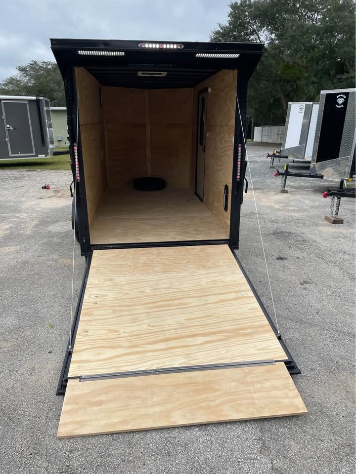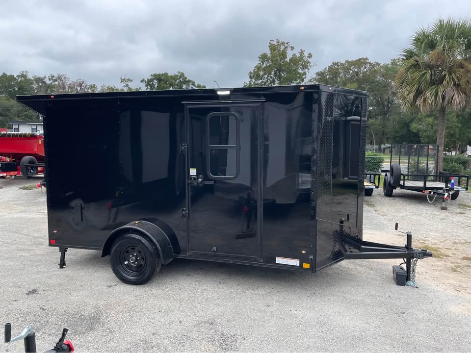 6×12 Single Axle Cargo Trailer – Blackout Pkg. – 6’6” interior height – 12’ + 2’ V- nose – Rear Spoiler – 60” Triple Tube Tongue (Extended tongue) – Fold Down Jack Stabilizers – 15×30 Slider Window w/ Tint & Screen in Side Door – .080 Poly-Cor Siding – Semi screwless exterior – 3500# axle w/ EZ lube hubs – *Spare tire included* – Smoked Roof Vent – Thermo cool ceiling liner – 36” Side door w/ flush lock, loading light & bar lock – Ramp door w/ assist, flap & double handles – V-nose w/ Slanted stoneguard – 3/4 plywood floors – 3/8 plywood walls – 3” steel tube main frame – 16” on center roof, walls & floor – 2 Way Aluminum Side vents – LED light package – LED rear loading light – ATP fenders – 205/75/15 radial tires – 2 5/16” coupler – 4 way flat light plug – 5 year limited manufacturer warranty