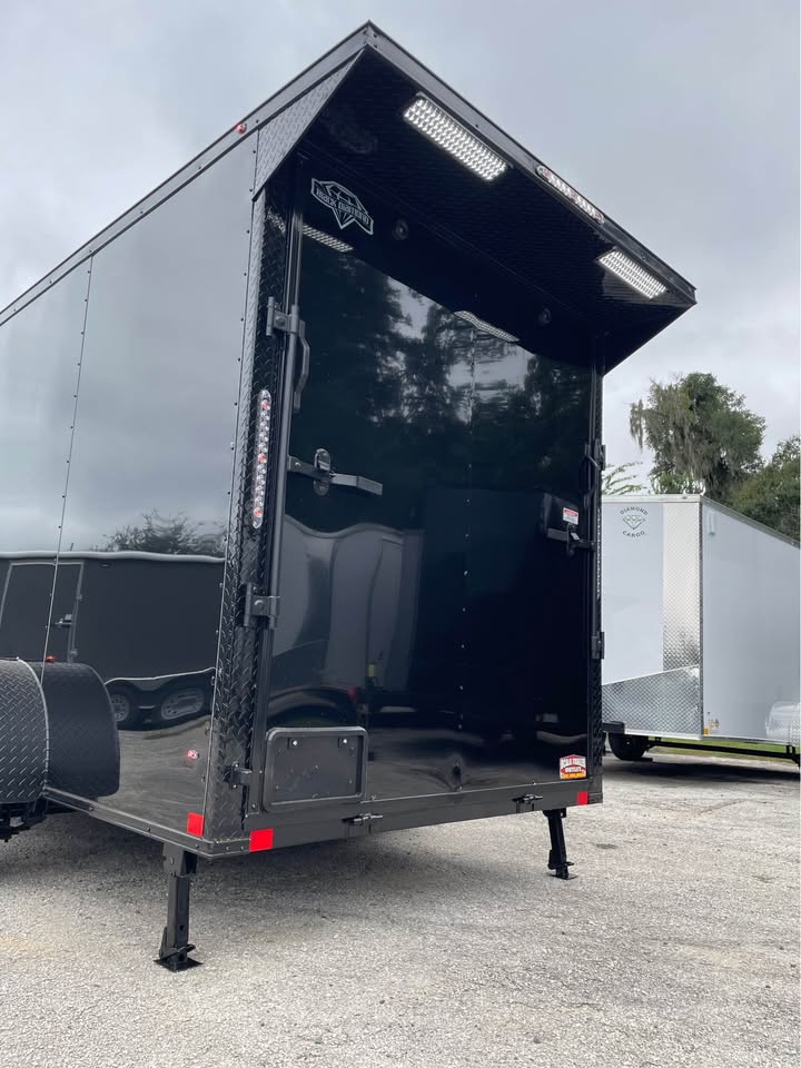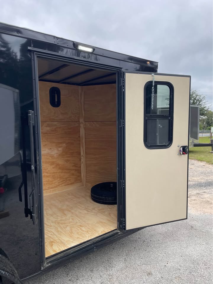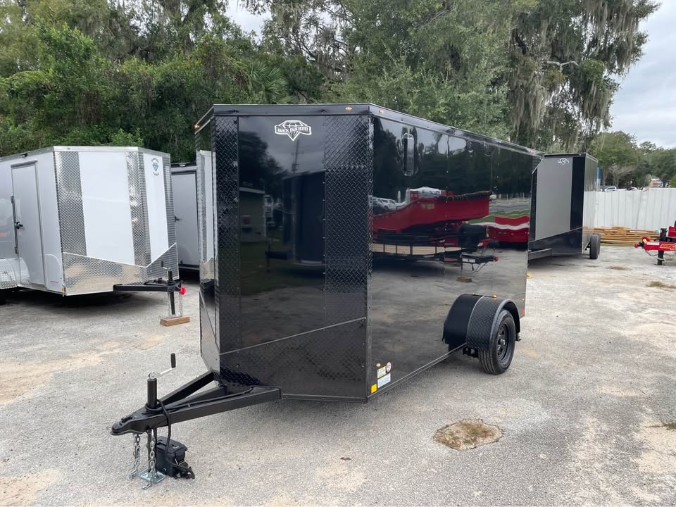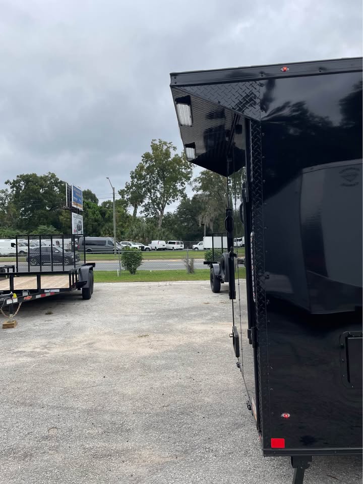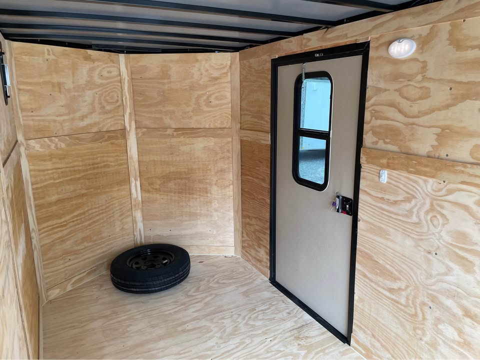 6×12 Single Axle Cargo Trailer – Blackout Pkg. – 6’6” interior height – 12’ + 2’ V- nose – Rear Spoiler – 60” Triple Tube Tongue (Extended tongue) – Fold Down Jack Stabilizers – 15×30 Slider Window w/ Tint & Screen in Side Door – .080 Poly-Cor Siding – Semi screwless exterior – 3500# axle w/ EZ lube hubs – *Spare tire included* – Smoked Roof Vent – Thermo cool ceiling liner – 36” Side door w/ flush lock, loading light & bar lock – Ramp door w/ assist, flap & double handles – V-nose w/ Slanted stoneguard – 3/4 plywood floors – 3/8 plywood walls – 3” steel tube main frame – 16” on center roof, walls & floor – 2 Way Aluminum Side vents – LED light package – LED rear loading light – ATP fenders – 205/75/15 radial tires – 2 5/16” coupler – 4 way flat light plug – 5 year limited manufacturer warranty