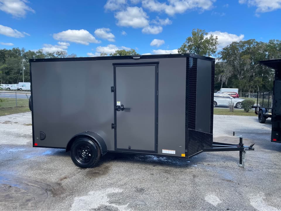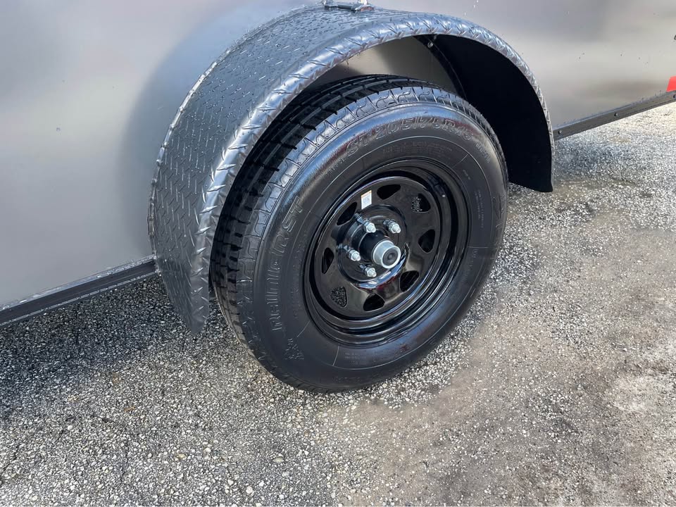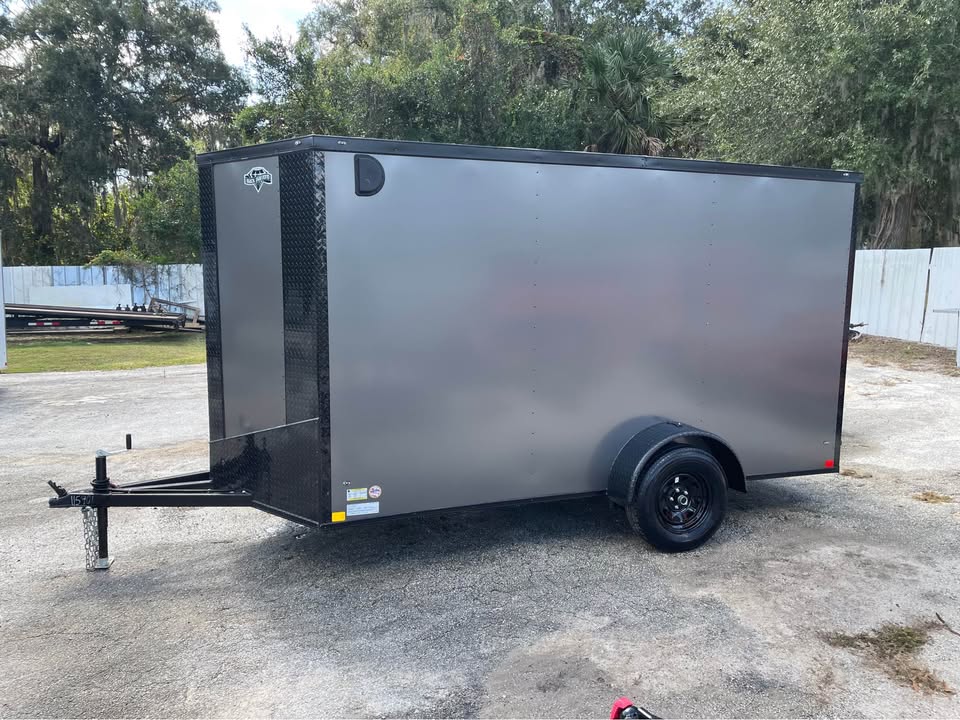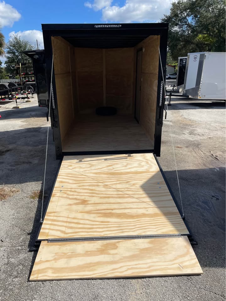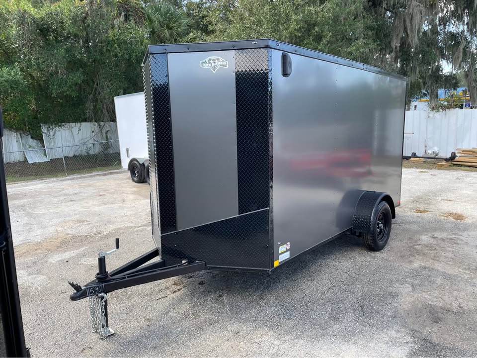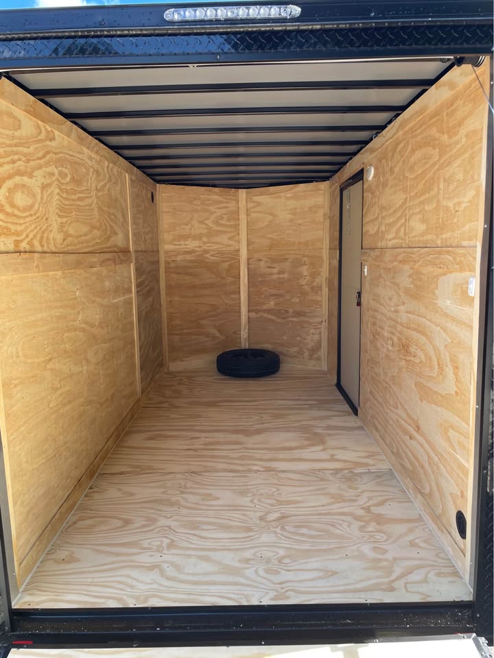 6×12 Single Axle Cargo Trailer – Blackout Pkg. – 6’6” interior height – 12’ + 2’ V- nose – Extended tongue – .080 Poly-Cor Siding – Semi screwless exterior – 3500# axle w/ EZ lube hubs – *Spare tire included* – Thermo cool ceiling liner – 36” Side door w/ flush lock, loading light & bar lock – Ramp door w/ assist, flap & double handles – V-nose w/ Slanted stoneguard – 3/4 plywood floors – 3/8 plywood walls – 3” steel tube main frame – 16” on center roof, walls & floor – Side vents – LED light package – LED rear loading light – ATP fenders – 205/75/15 radial tires – 2 5/16” coupler – 4 way flat light plug – 5 year limited manufacturer warranty