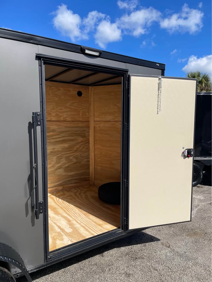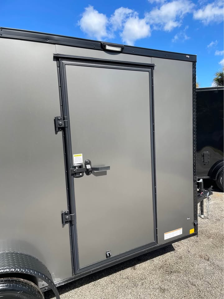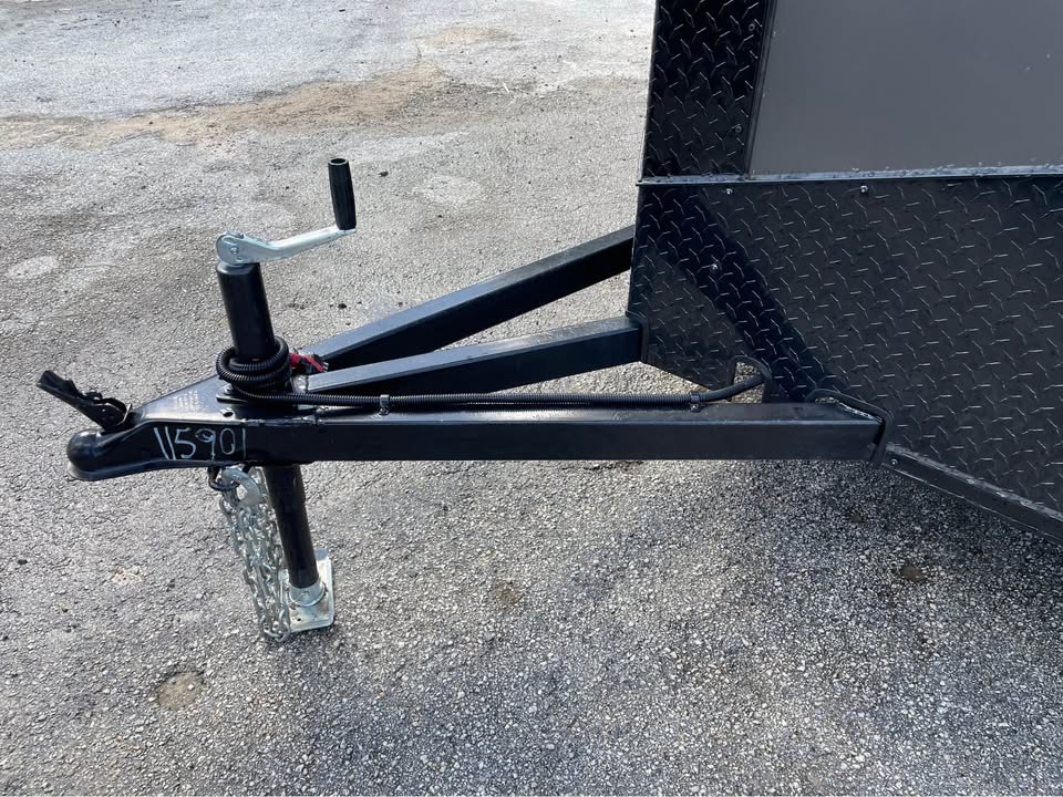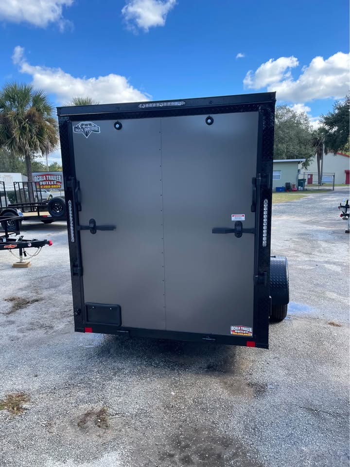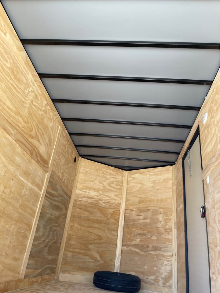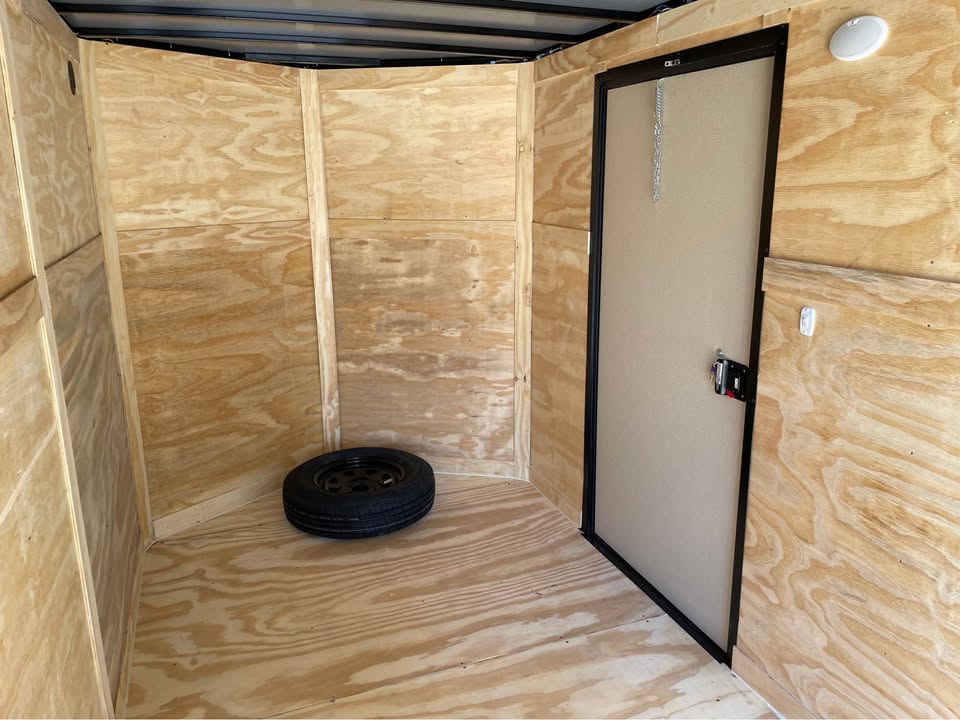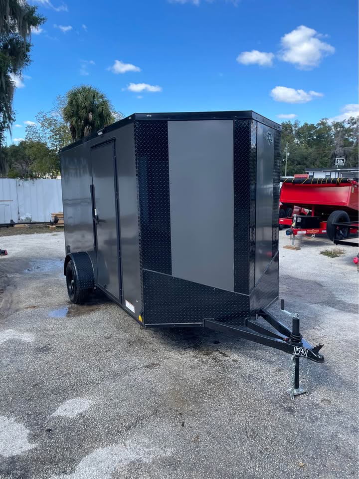 6×12 Single Axle Cargo Trailer – Blackout Pkg. – 6’6” interior height – 12’ + 2’ V- nose – Extended tongue – .080 Poly-Cor Siding – Semi screwless exterior – 3500# axle w/ EZ lube hubs – *Spare tire included* – Thermo cool ceiling liner – 36” Side door w/ flush lock, loading light & bar lock – Ramp door w/ assist, flap & double handles – V-nose w/ Slanted stoneguard – 3/4 plywood floors – 3/8 plywood walls – 3” steel tube main frame – 16” on center roof, walls & floor – Side vents – LED light package – LED rear loading light – ATP fenders – 205/75/15 radial tires – 2 5/16” coupler – 4 way flat light plug – 5 year limited manufacturer warranty