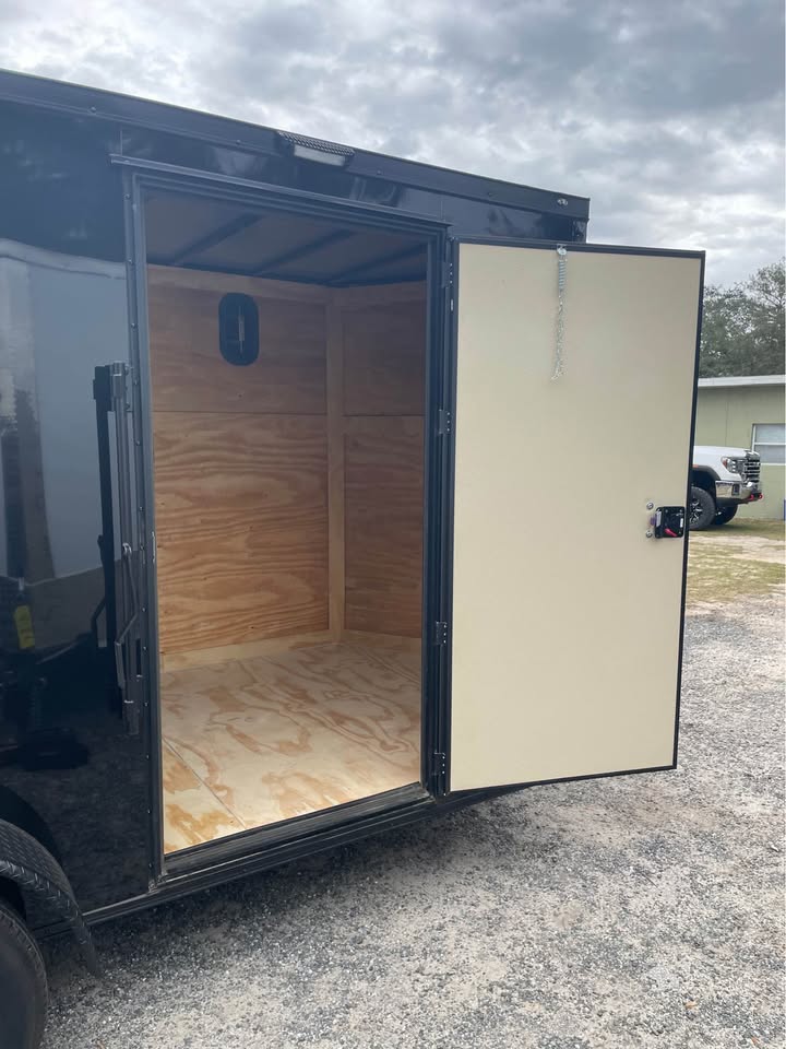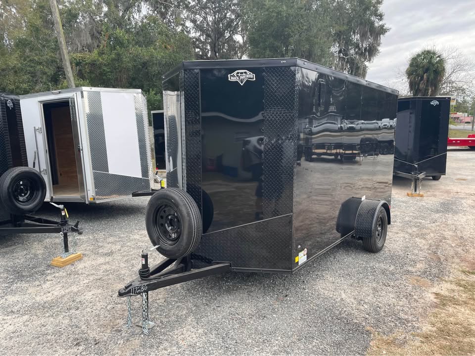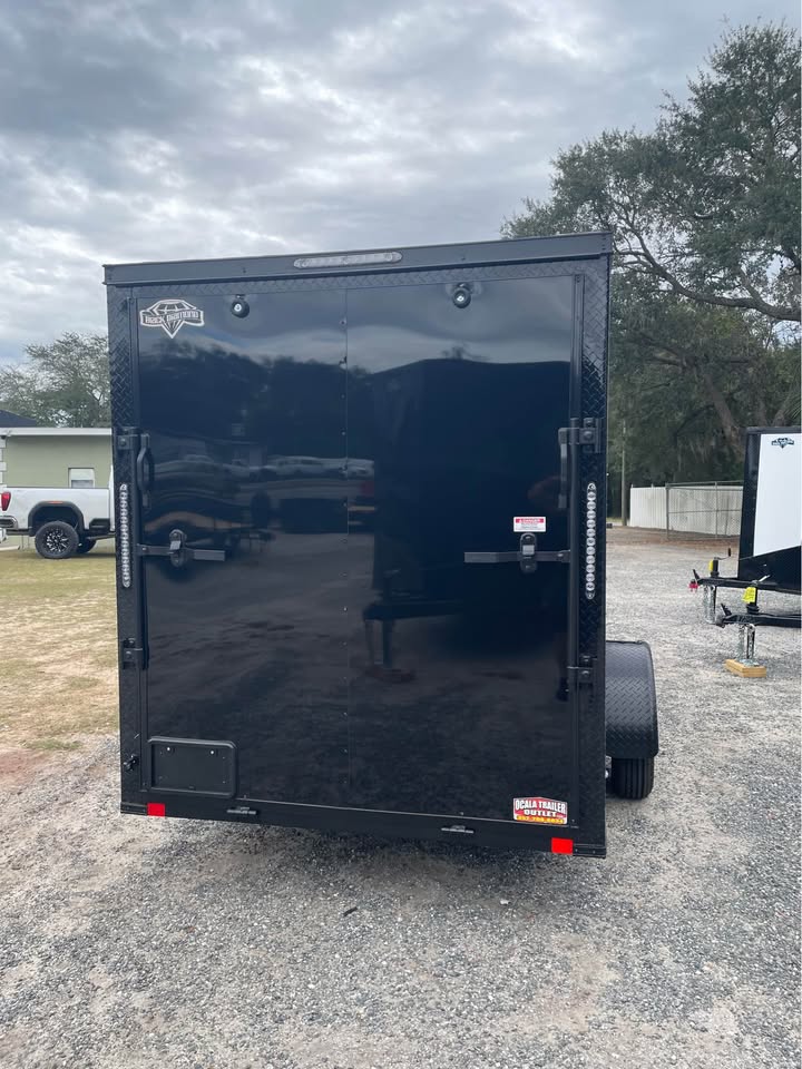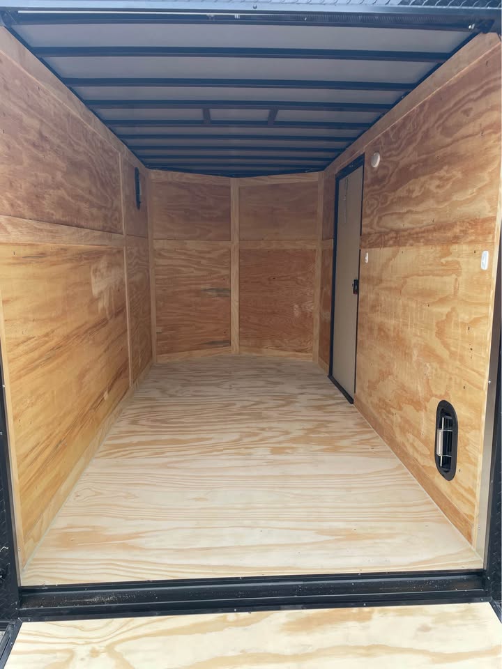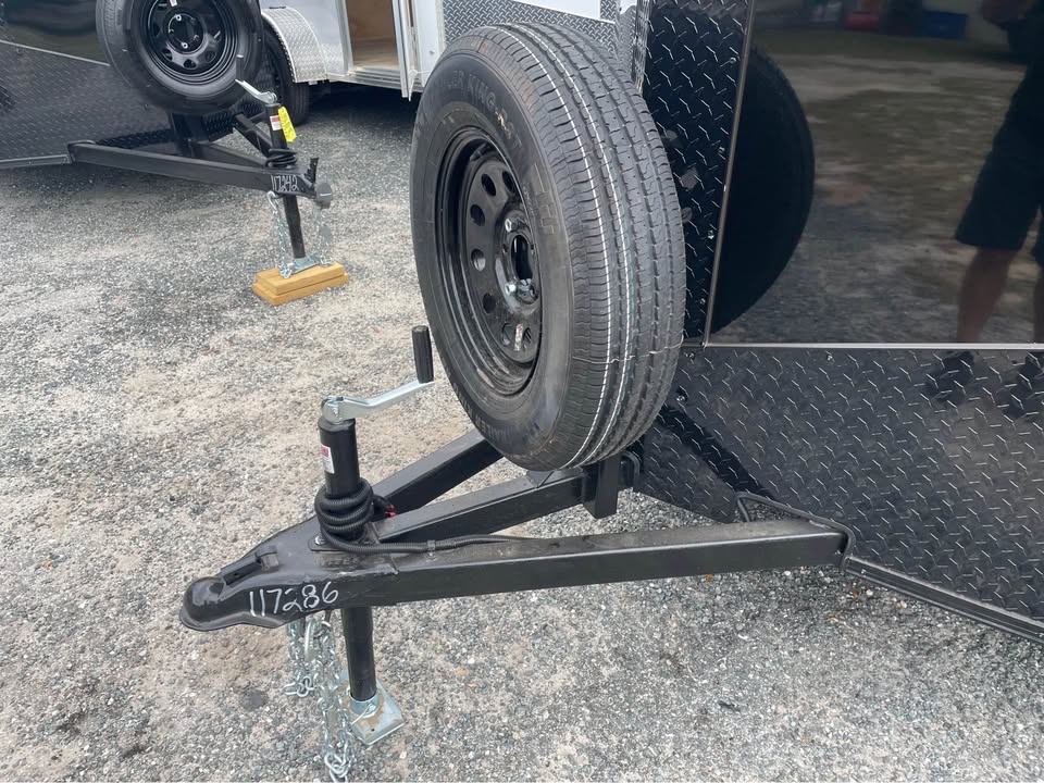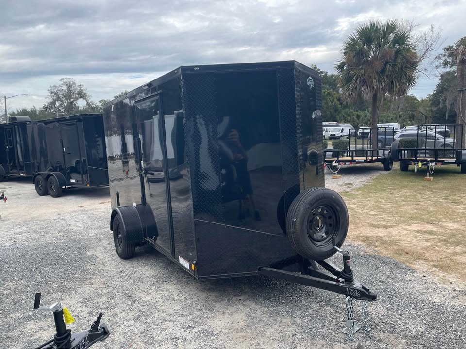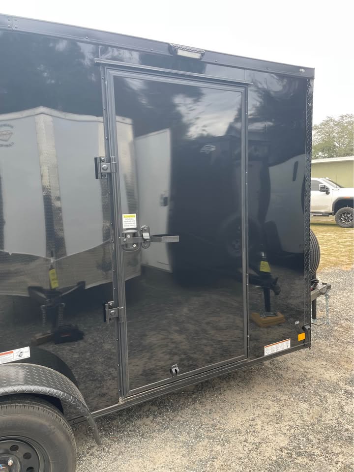 6×12 Single Axle Cargo Trailer – Blackout Pkg. – 6’6” interior height – 12’ + 2’ V- nose – Extended tongue w/ spare Mount – *Spare Tire included Free* – .080 Poly-Cor Siding – Semi screwless exterior – 3500# Suretrac axle w/ EZ lube hubs – Thermo cool ceiling liner – 32” Side door w/ flush lock, loading light & bar lock – Ramp door w/ assist, flap & double handles – V-nose w/ Slanted stoneguard – 3/4 plywood floors – 3/8 plywood walls – 3” steel tube main frame – 16” on center roof, walls & floor – Side vents – Brace for A/C or Roof Vent – LED light package – LED rear loading light – ATP fenders – 205/75/15 radial tires – 2 5/16” coupler – 4 way flat light plug – 5 year limited manufacturer warranty