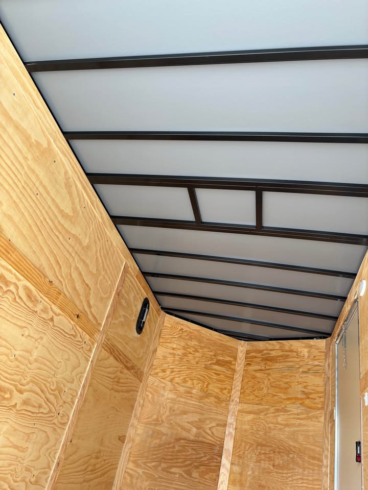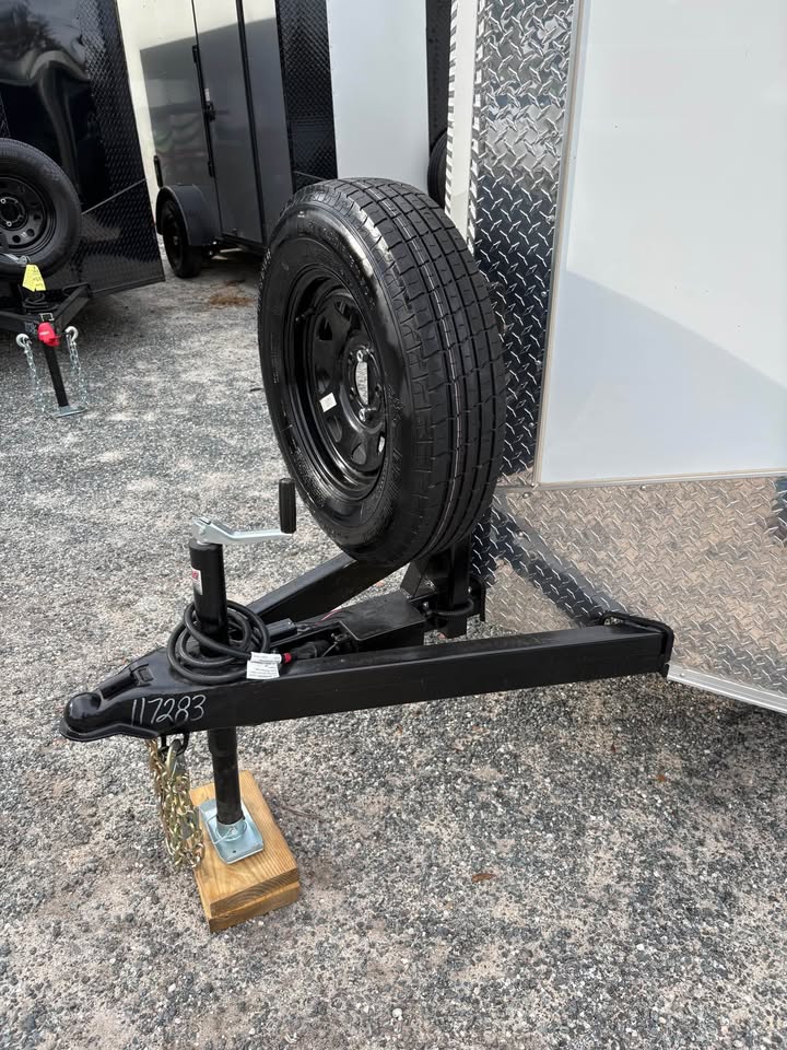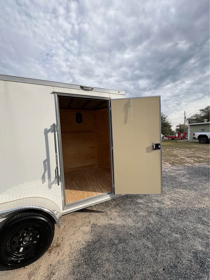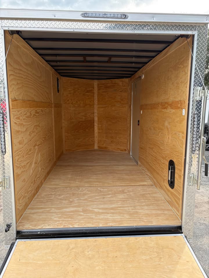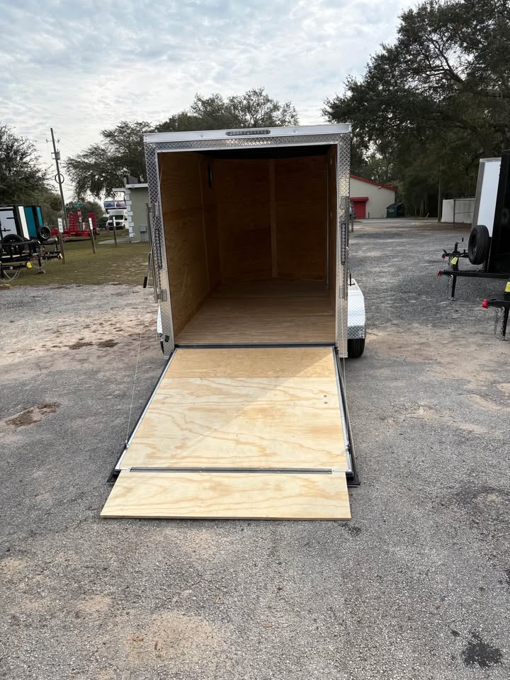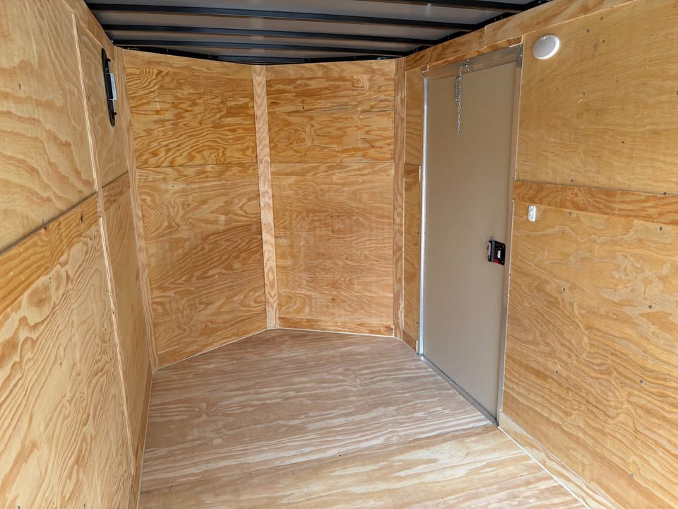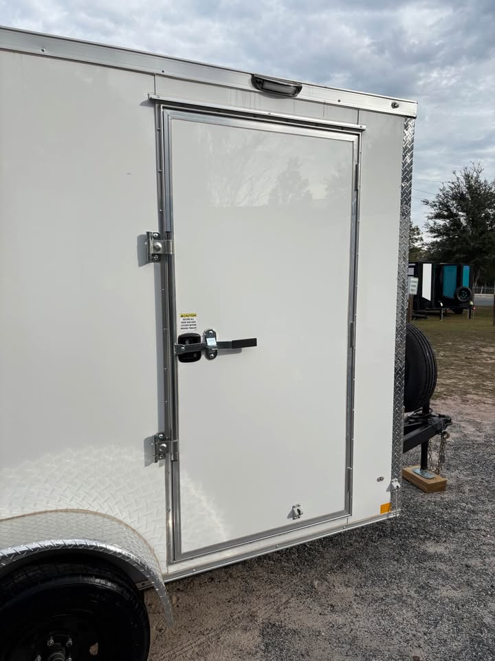 6×12 Tandem Axle Cargo Trailer – 6’6” interior height – 12’ + 2’ V- nose – Extended tongue w/ Spare Tire & Mount – .080 Poly-Cor Siding – Semi screwless exterior – 2/3500# SureTrac brake axles w/ EZ lube hubs – Smoke Colored Roof Vent – Thermo cool ceiling liner – 36” Side door w/ flush lock w/ loading light & bar lock – Ramp door w/ assist, flap & double handles – V-nose w/ Slanted stoneguard – 3/4 plywood floors – 3/8 plywood walls – 4” steel tube main frame – 16” on center roof, walls & floor – 2 Way aluminum side vents – LED light package – LED rear loading light – ATP fenders – 205/75/15 radial tires – 2 5/16” coupler – 7 way Bargman plug – 5 year limited manufacturer warranty