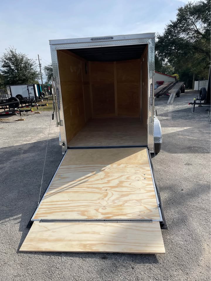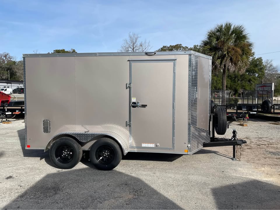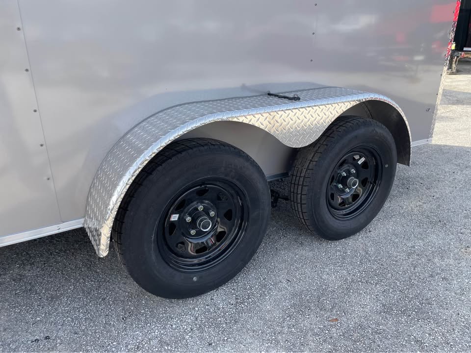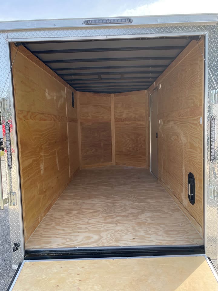 6×12 Tandem Axle Cargo Trailer – 6’6” interior height – 12’ + 2’ V- nose – Extended tongue w/ Spare Tore & Mount – .080 Poly-Cor Siding – Semi screwless exterior – 2/3500# SureTrac brake axles w/ EZ lube hubs – Smoke Colored Roof Vent – Thermo cool ceiling liner – 36” Side door w/ flush lock w/ loading light & bar lock – Ramp door w/ assist, flap & double handles – V-nose w/ Slanted stoneguard – 3/4 plywood floors – 3/8 plywood walls – 4” steel tube main frame – 16” on center roof, walls & floor – 2 Way aluminum side vents – LED light package – LED rear loading light – ATP fenders – 205/75/15 radial tires – 2 5/16” coupler – 7 way Bargman plug – 5 year limited manufacturer warranty