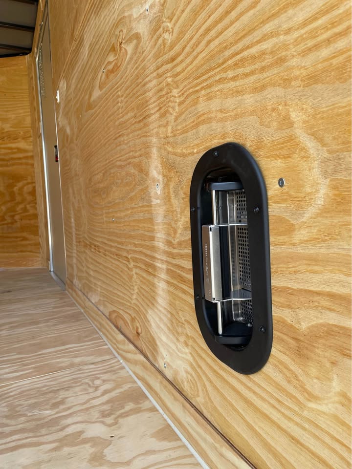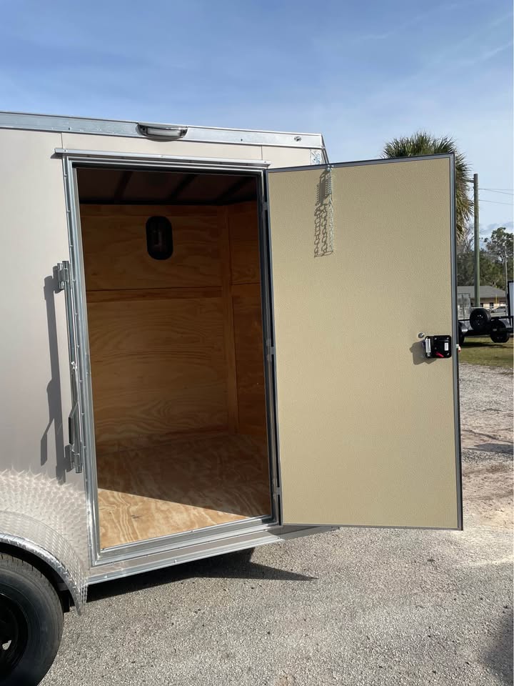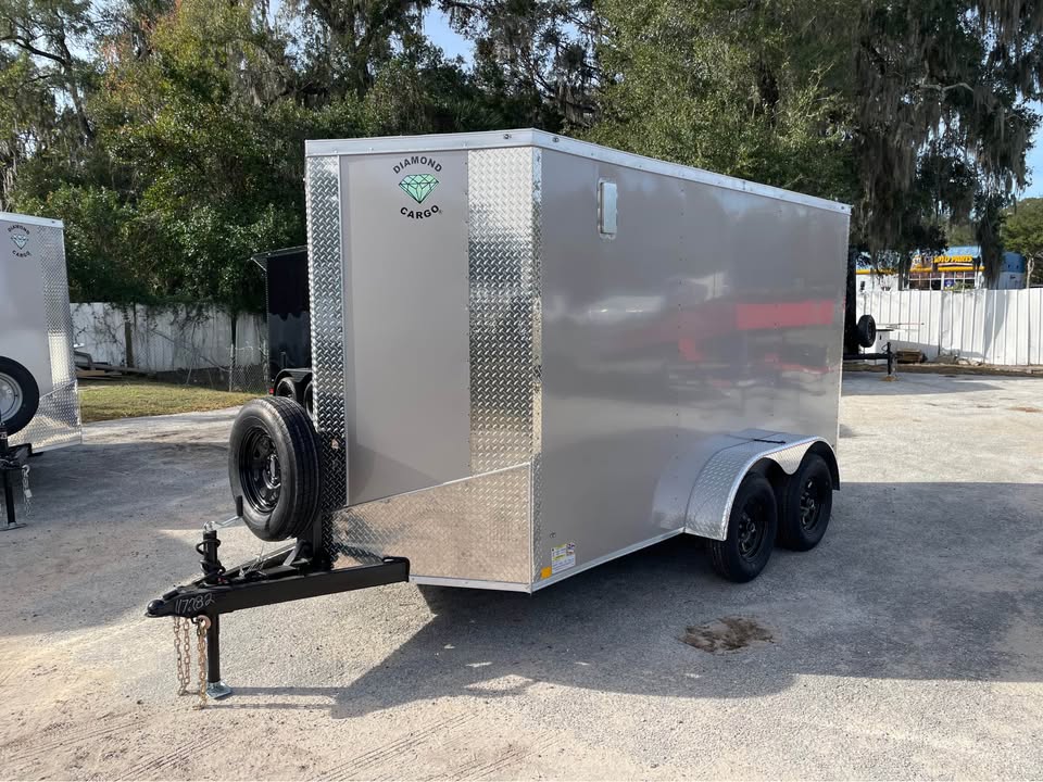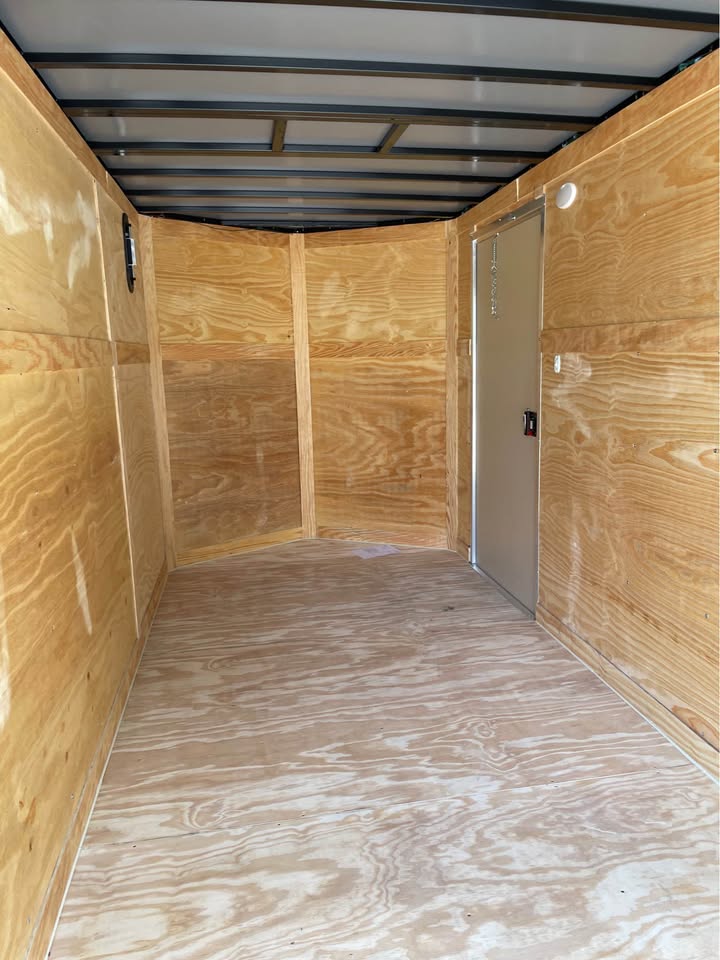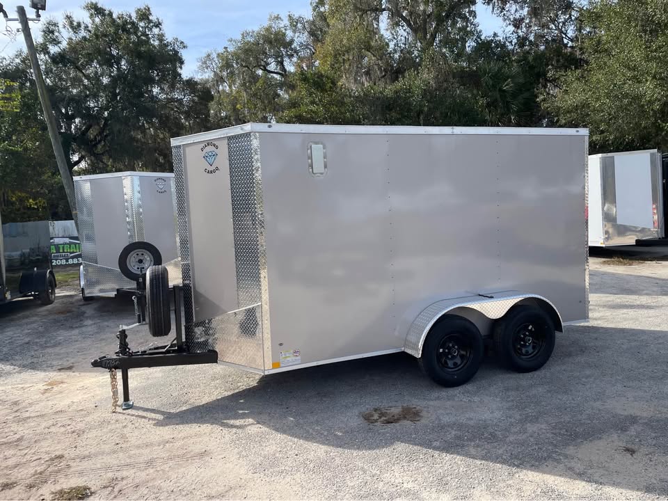 6×12 Tandem Axle Cargo Trailer – 6’6” interior height – 12’ + 2’ V- nose – Extended tongue w/ Spare Tore & Mount – .080 Poly-Cor Siding – Semi screwless exterior – 2/3500# SureTrac brake axles w/ EZ lube hubs – Smoke Colored Roof Vent – Thermo cool ceiling liner – 36” Side door w/ flush lock w/ loading light & bar lock – Ramp door w/ assist, flap & double handles – V-nose w/ Slanted stoneguard – 3/4 plywood floors – 3/8 plywood walls – 4” steel tube main frame – 16” on center roof, walls & floor – 2 Way aluminum side vents – LED light package – LED rear loading light – ATP fenders – 205/75/15 radial tires – 2 5/16” coupler – 7 way Bargman plug – 5 year limited manufacturer warranty