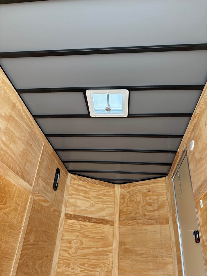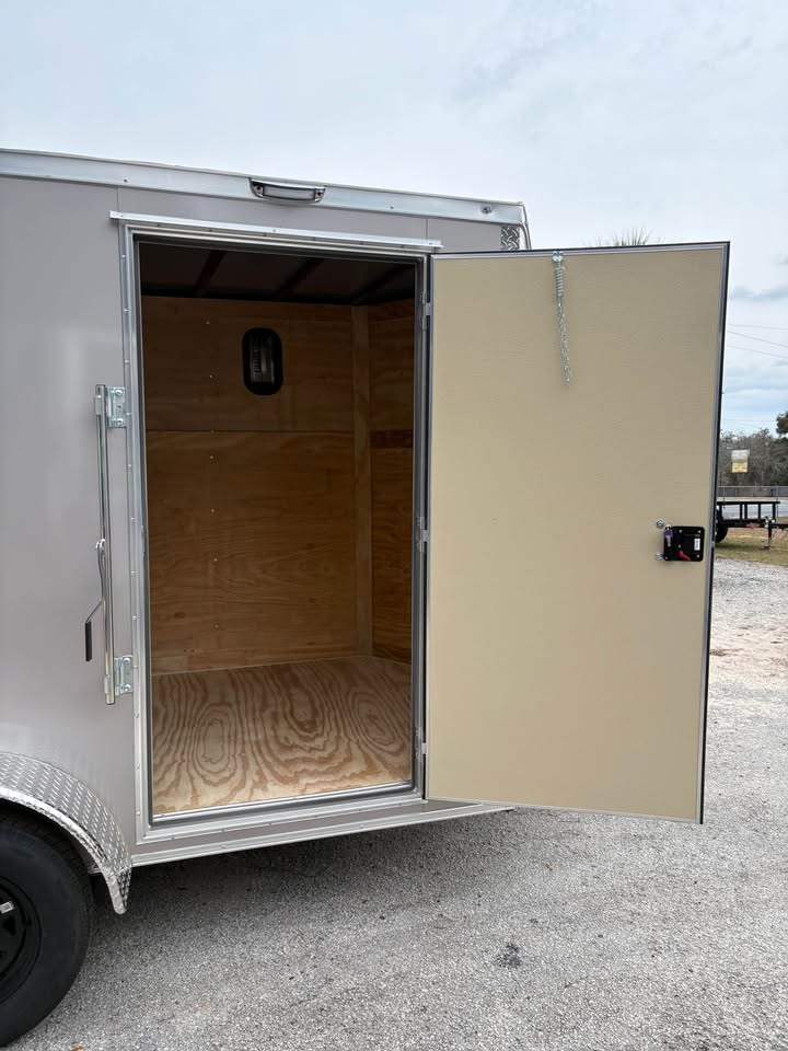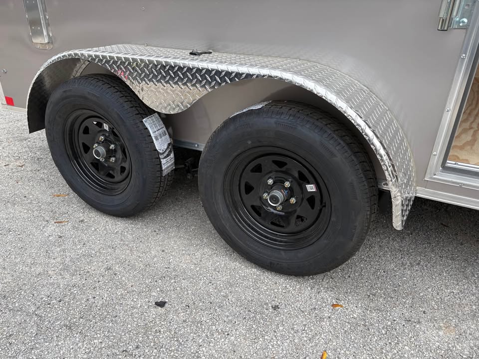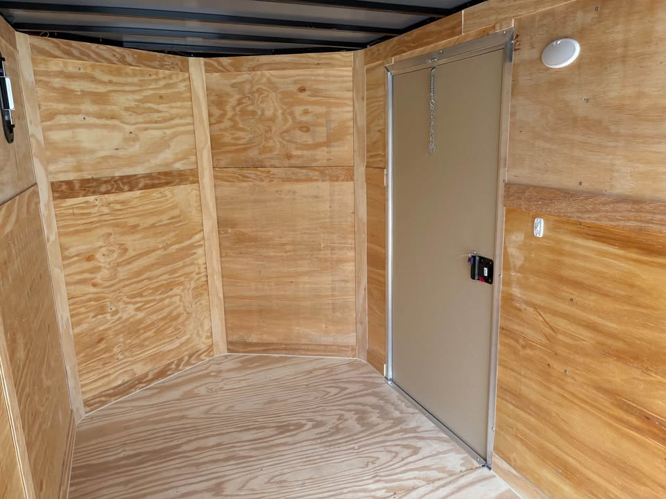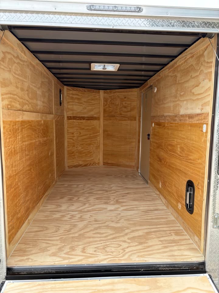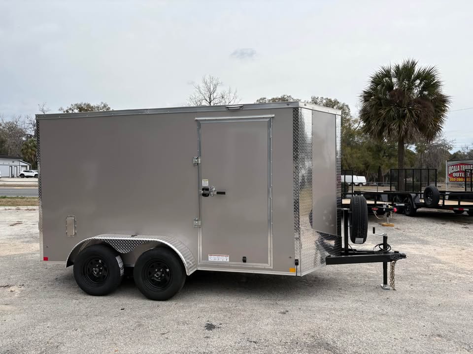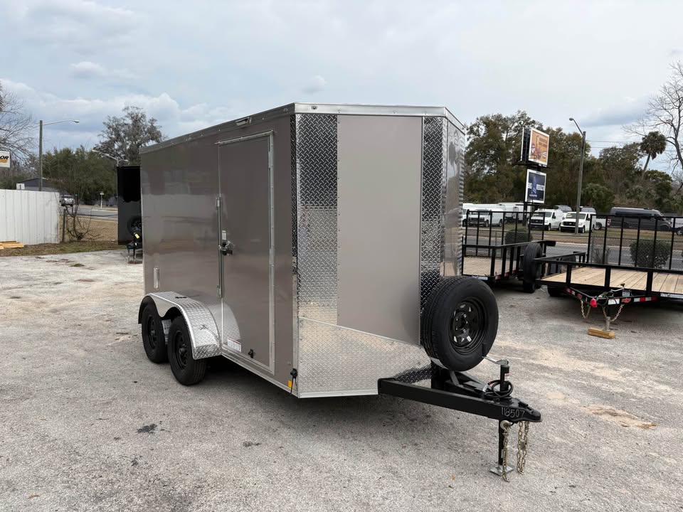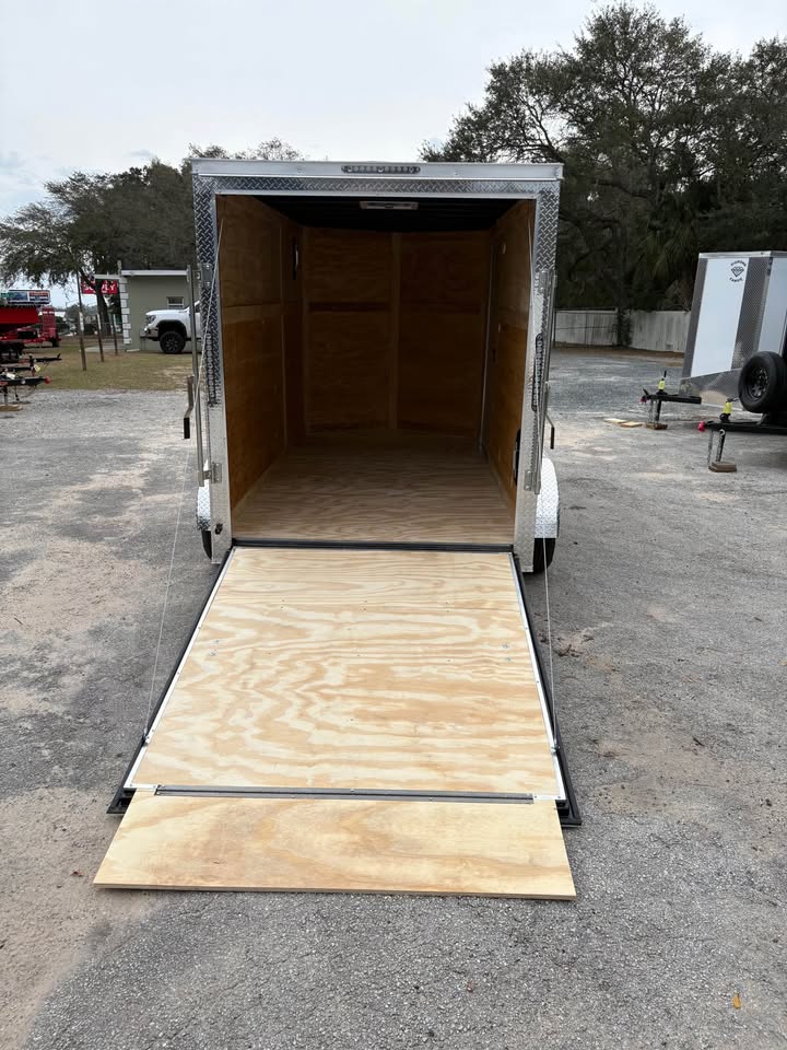 6×12 Tandem Axle Cargo Trailer – 6’6” interior height – 12’ + 2’ V- nose – Extended tongue w/ spare tire & mount – .080 Poly-Cor Siding – Semi screwless exterior – 2/3500# SureTrac brake axles w/ EZ lube hubs – Thermo cool ceiling liner – Roof Vent – 36” Side door w/ flush lock & bar lock – Ramp door w/ assist, flap & double handles – V-nose w/ Slanted stoneguard – 3/4 plywood floors – 3/8 plywood walls – 4” steel tube main frame – 16” on center roof, walls & floor – 2 Way aluminum side vents – LED light package – LED rear loading light – ATP fenders – 205/75/15 radial tires – 2 5/16” coupler – 7 way Bargman plug – 5 year limited manufacturer warranty