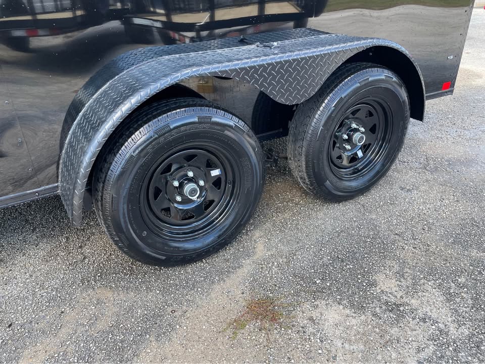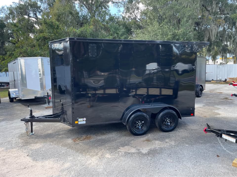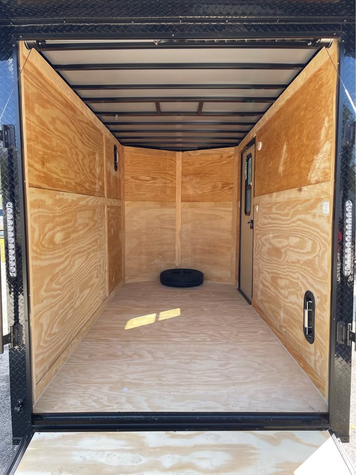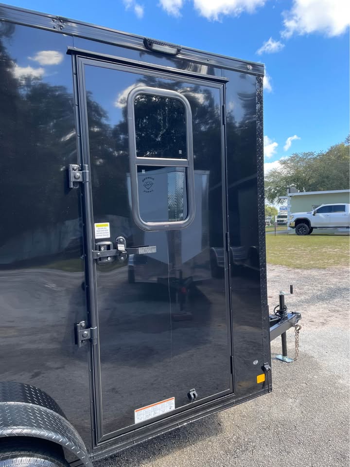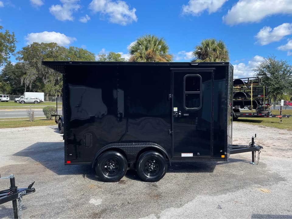 6×12 Tandem Axle Cargo Trailer – Blackout Pkg. – 7’ Interior height – 12’ + 2’ V- nose – Rear Spoiler – 60” Triple Tube Tongue (Extended tongue) – 15×30 Slider Window w/ Tint & Screen in Side Door – .080 Poly-Cor Siding – Semi screwless exterior – 3500# axle w/ EZ lube hubs – *Spare tire included* – Braces for A/C or Roof Vent – Thermo cool ceiling liner – 36” Side door w/ flush lock, loading light & bar lock – Ramp door w/ assist, flap & double handles – V-nose w/ Slanted stoneguard – 3/4 plywood floors – 3/8 plywood walls – 3” steel tube main frame – 16” on center roof, walls & floor – 2 Way Aluminum Side vents – LED light package – LED rear loading light – ATP fenders – 205/75/15 radial tires – 2 5/16” coupler – 4 way flat light plug – 5 year limited manufacturer warranty
