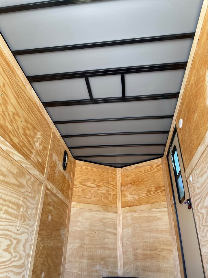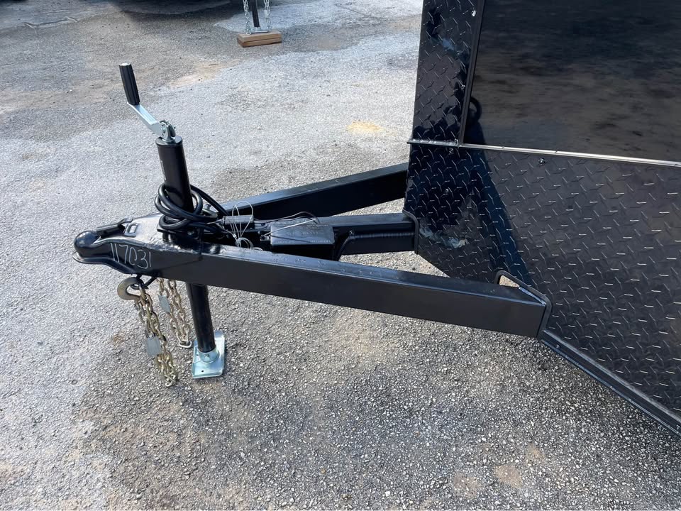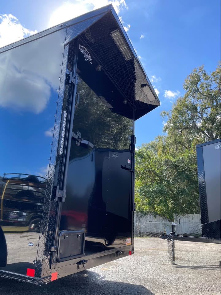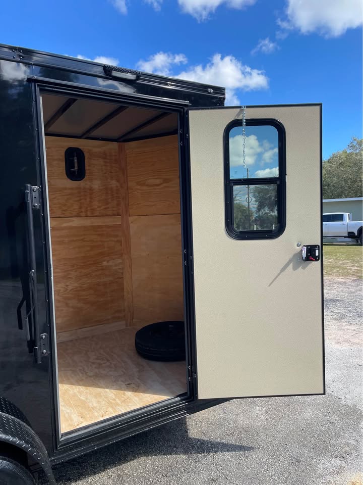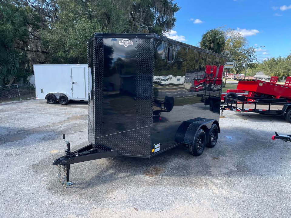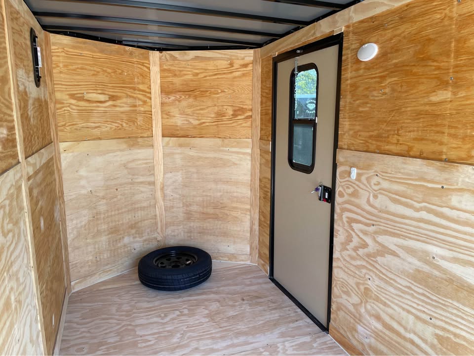 6×12 Tandem Axle Cargo Trailer – Blackout Pkg. – 7’ Interior height – 12’ + 2’ V- nose – Rear Spoiler – 60” Triple Tube Tongue (Extended tongue) – 15×30 Slider Window w/ Tint & Screen in Side Door – .080 Poly-Cor Siding – Semi screwless exterior – 3500# axle w/ EZ lube hubs – *Spare tire included* – Braces for A/C or Roof Vent – Thermo cool ceiling liner – 36” Side door w/ flush lock, loading light & bar lock – Ramp door w/ assist, flap & double handles – V-nose w/ Slanted stoneguard – 3/4 plywood floors – 3/8 plywood walls – 3” steel tube main frame – 16” on center roof, walls & floor – 2 Way Aluminum Side vents – LED light package – LED rear loading light – ATP fenders – 205/75/15 radial tires – 2 5/16” coupler – 4 way flat light plug – 5 year limited manufacturer warranty
