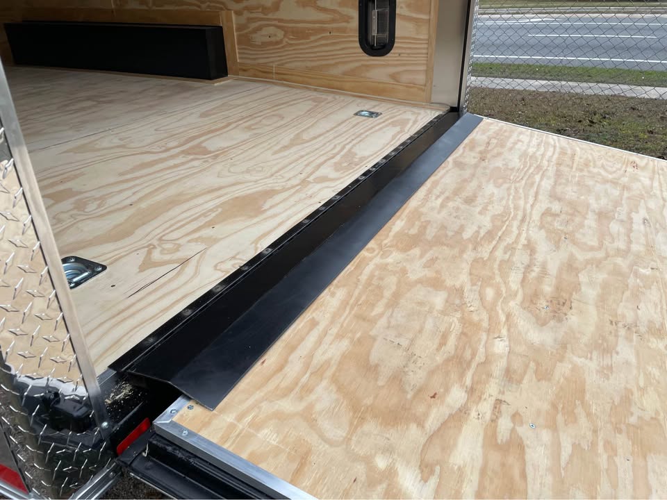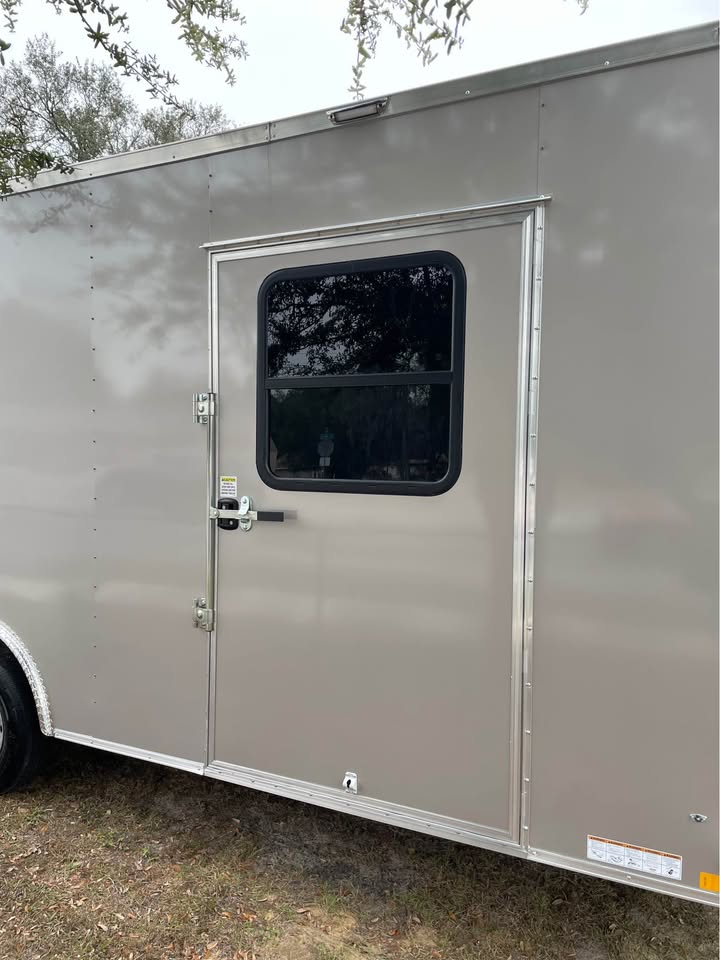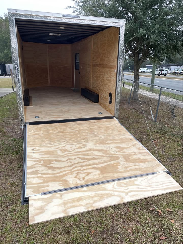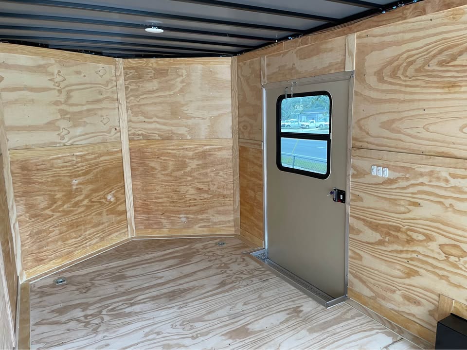 – 20’ + 2’ V Nose – 2/6000# (12,000GVWR) Suretrac Brake Axles – 7’ 6” Interior Height – .080 PolyCor siding – 60” Triple tube extended tongue (Extended Tongue) – Spare Tire Mounted on Tongue – “12” OC Crossmember Floor” – 16” OC Walls & Celing – One Piece Aluminum Roof – Thermoply ceiling liner – HD Ramp Door w/ Transition Flap & Steel Transition Flap – Roof Vent – 48” RV side door w/ flush lock & bar lock – 30×30 Slider Window Tinted w/ Screen in Side Door – 4’ LED Kemper Interior Light – 2 Way Aluminum Side Vents – LED Loading Lights on Rear & Side Doors – LED Light Package – 2 5/16” coupler – 7 way Bargman plug – 5 year limited manufacturer warranty
