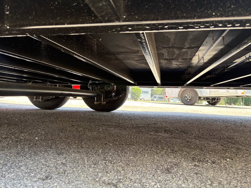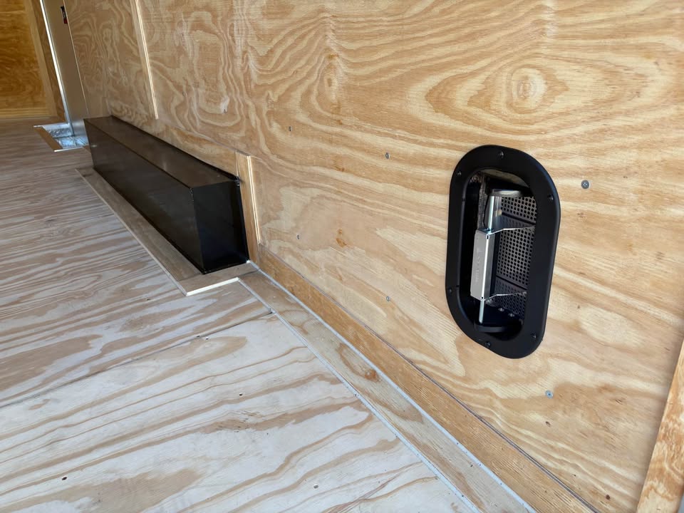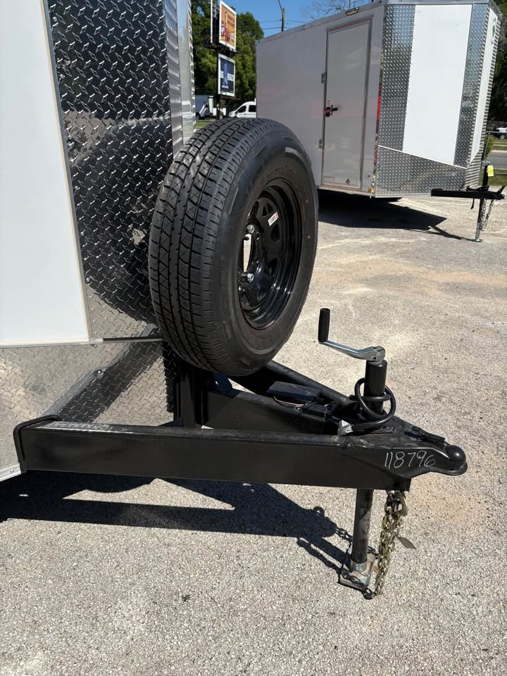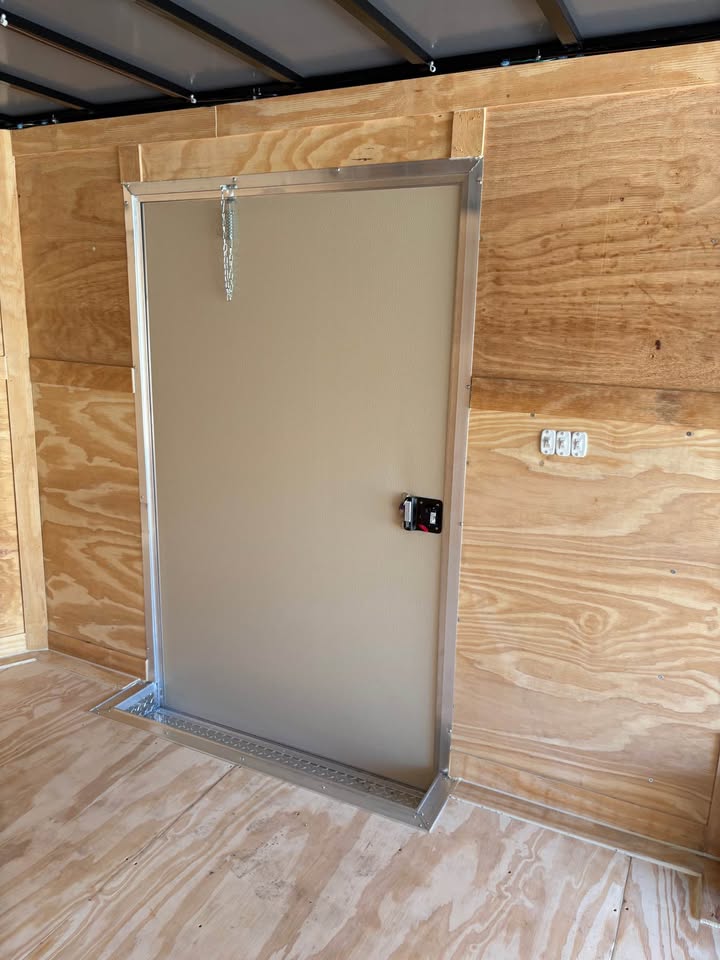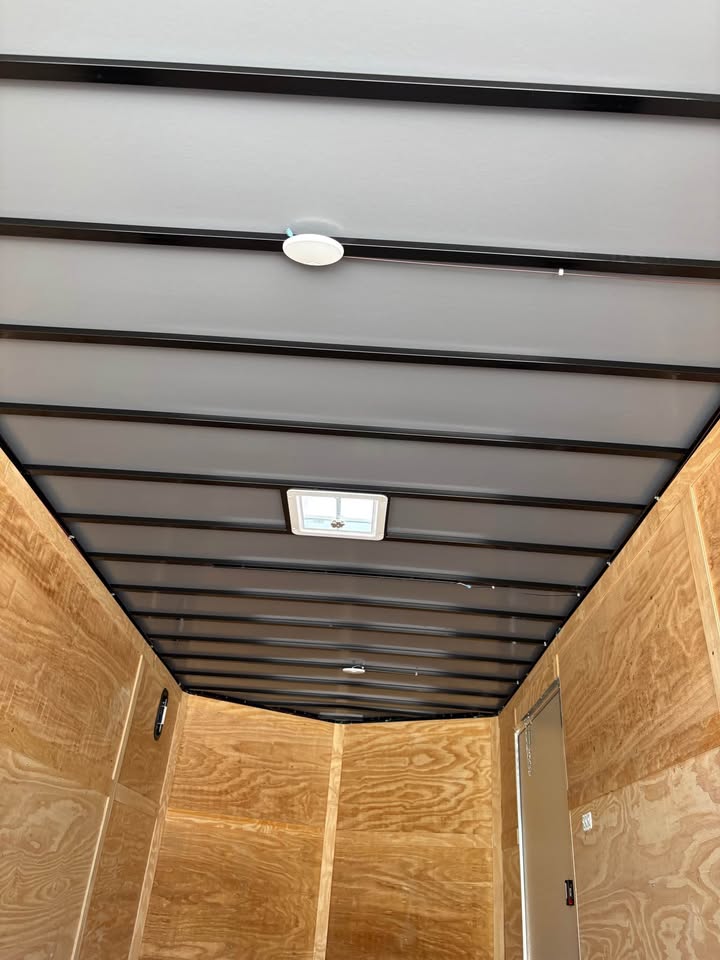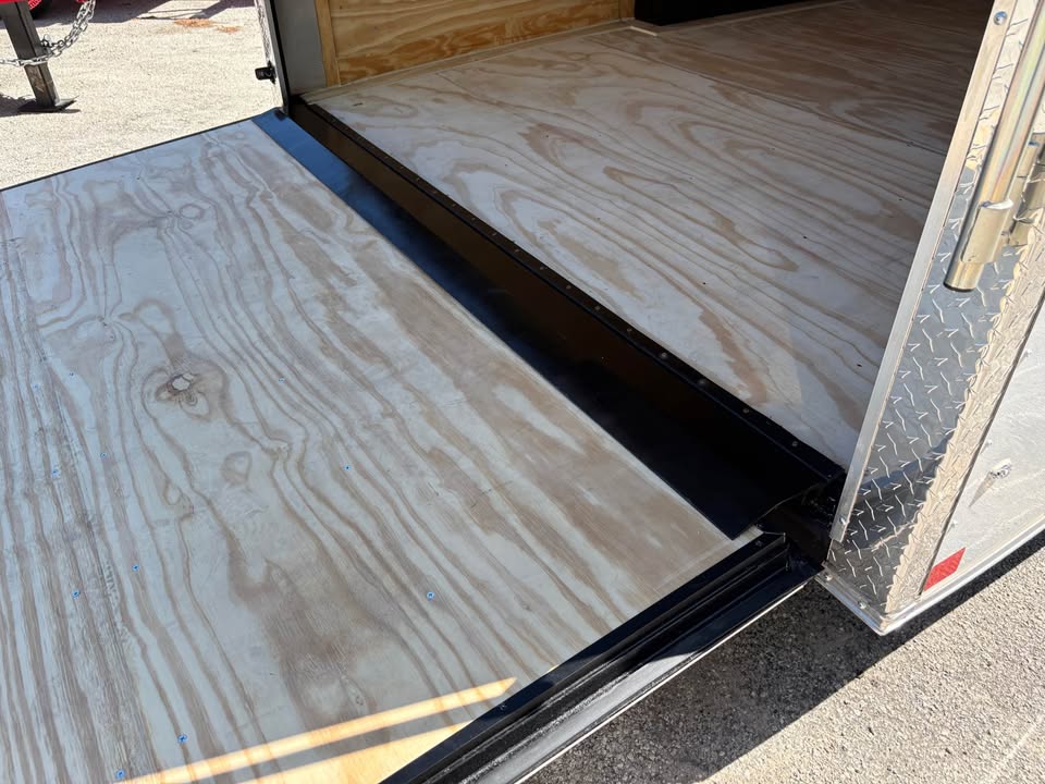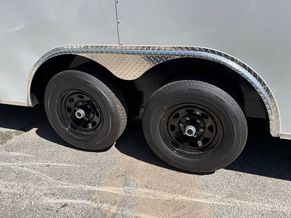 *Added Features: (2) 6,000 lbs. Electric Brake Axles, 60″ Triple Tube Tongue (Extended Tongue), Spare Tire & Mount on Tongue, Slanted Stoneguard, 48″ Side Door, Steel Transition Flap, Non-Powered Roof Vent, 2-Way Alum. Side Vents, One Piece Alum. Roof, 12″ On Center Floor Crossmembers, 4′ Interior Strip Light