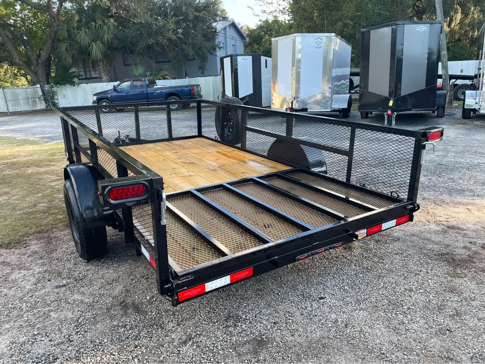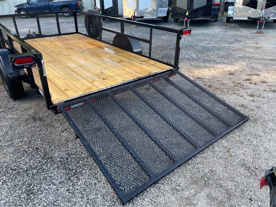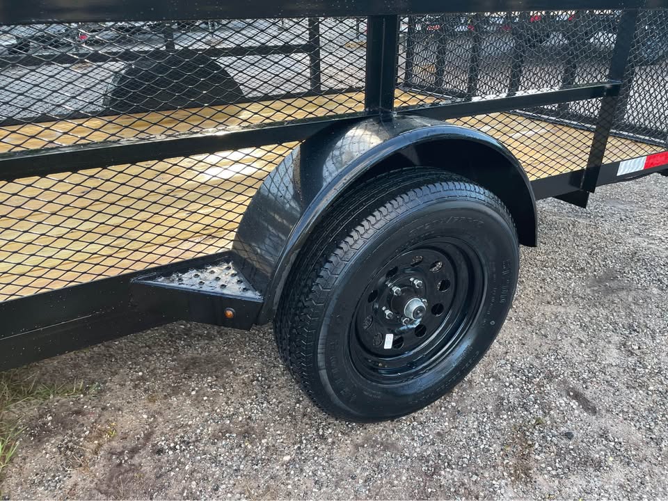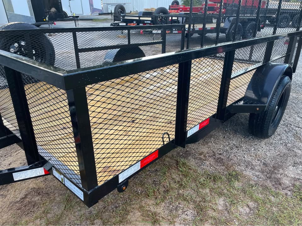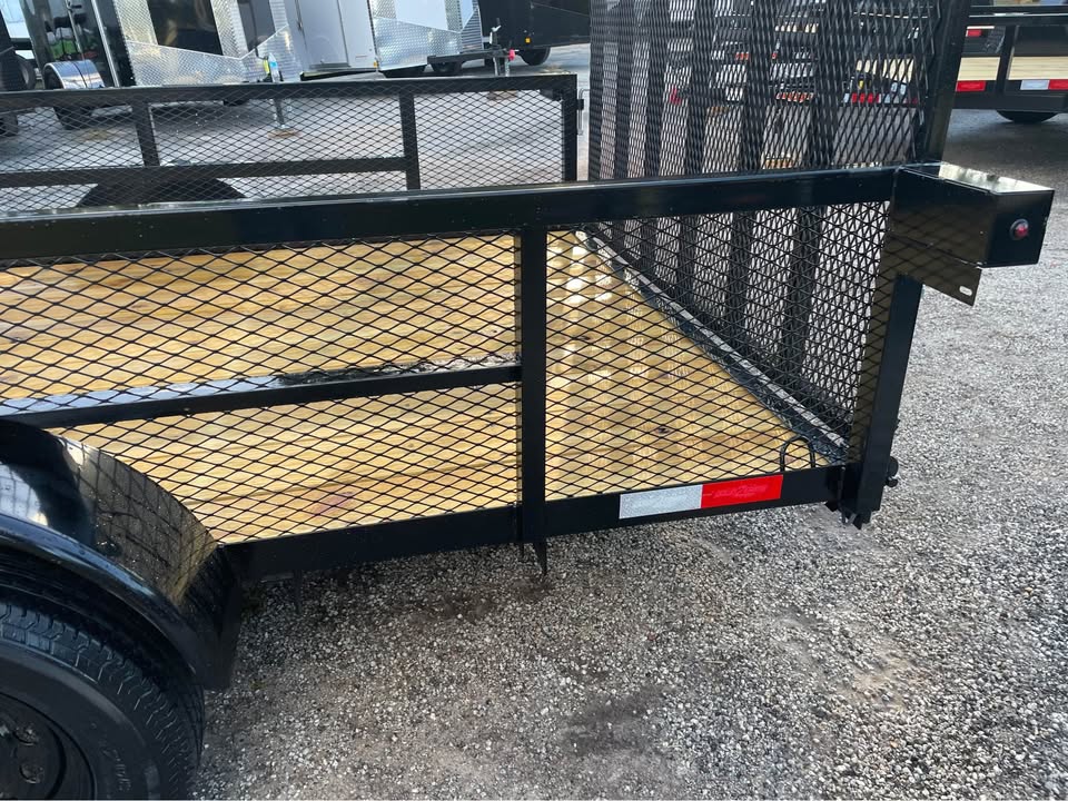 6.5×12 single axle utility trailer – 24” mesh sides – 3500# Dexter axle – Payload capacity- 2420 lbs. – 15” radial tires & wheels – spare tire & mount – Set back- Fold up jack – Spring Assist on Gate – 48”h gate w/ steel square tube – 2” coupler – 2×2” steel square tube top rail – LED light package – 2×8 pressure treated wood deck – triple braced tongue – wraparound frame – 2” coupler – 4 flat pigtail – powder coated paint One year warranty