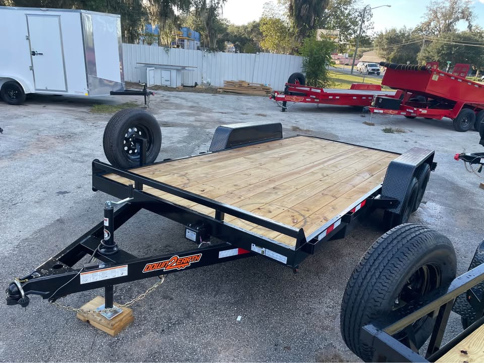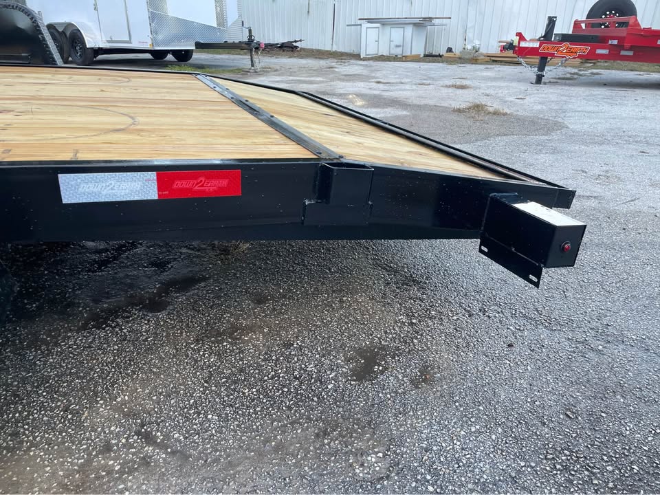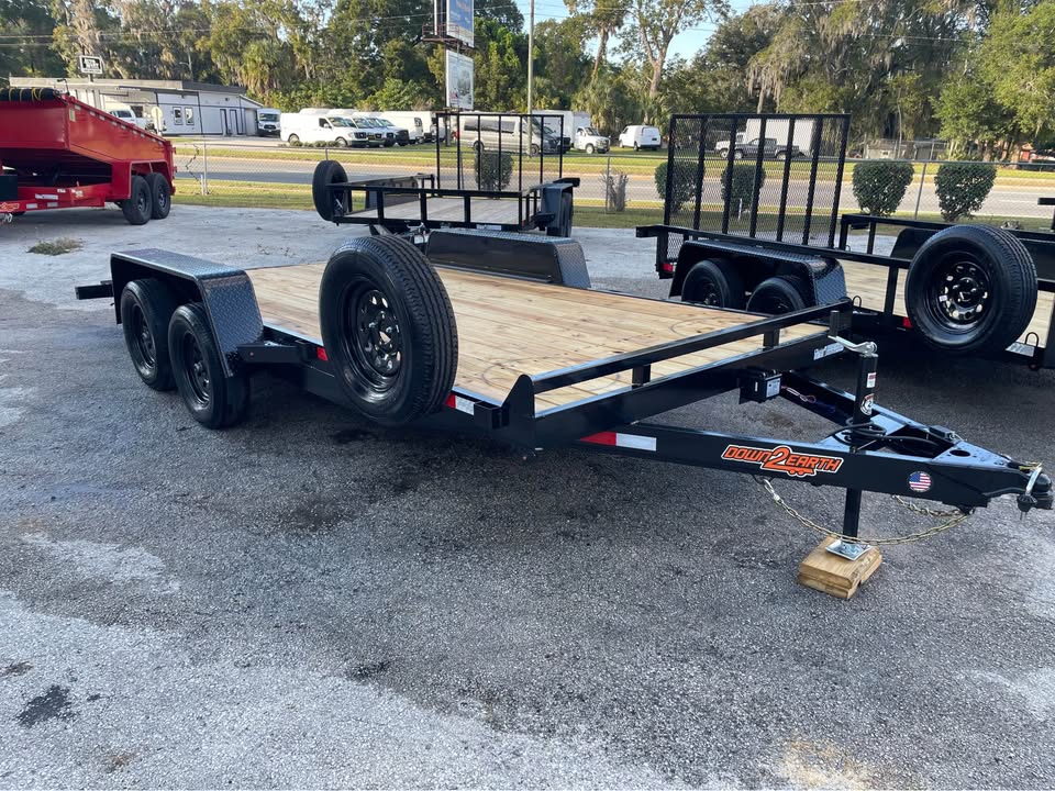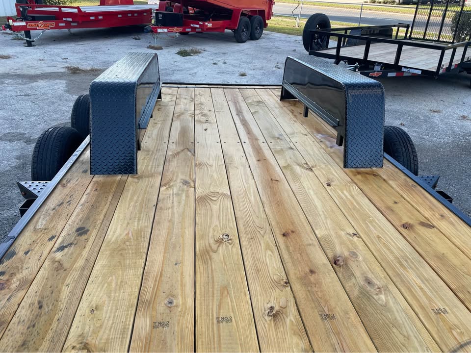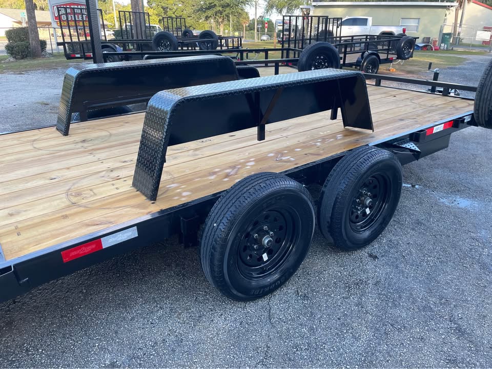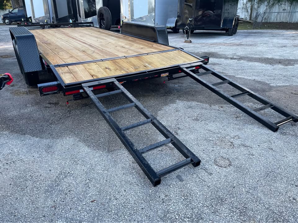 82”x16’ 7k Car Hauler – 14’ deck 2’ dovetail – 2/3500# Dexter brake axles – Payload capacity- 5,300# – stake pockets – 5” channel frame w/ wraparound tongue – Both removable HD fenders – Spare tire & mount included – Set back 5k jack – Rear slide out ramps – 2×8 Pressure treated wood – LED light package – All powder coated frame – 2 5/16” coupler – 7 way Bargman plug One Year Warranty